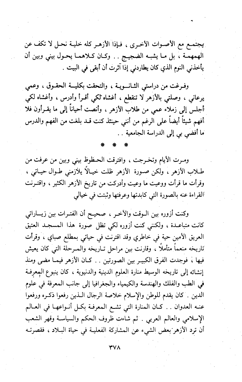 ومرت الأيام وتخرجت، وافترقت الحظوظ بيني وبين من عرفت من طلاب الأزهر، ولكن صورة الأزهر ظلت خيالا يلازمني طوال حياتي، وقرأت ما قرأت ووعيت ما وعيت وأدركت من تاريخ الأزهر الكثير، واقترنت القراءة عنه بالصورة التي كابدتها وعرفتها وثبتت في خيالي، وكنت أزوره بين الوقت والآخر، صحيح أن الفترات بين زياراتي كانت متباعدة، ولكنني كنت أزوره لكي تظل صورة هذا المسجد العتيق العريق الأمين حية في خاطري وقد اقترنت في حياتي بمطلع صباي، وقرأت تاريخه منعما متأملا، وقارنت بين مراحل تاريخه والمرحلة التي كان يعيش فيها، فوجدت الفرق الكبير بين الصورتين. . كان الأزهر فيما مضى ومنذ إنشائه إلى تاريخه الوسيط منارة العلوم الدينية والدنيوية، كان ينبوع المعرفة في الطب والفلك والهندسة والكيمياء والجغرافيا إلى جانب المعرفة في علوم الدين. كان يقدم للوطن والإسلام خلاصة الرجال الذين رفعوا ذكره ورفعوا عنه العدوان. . كان المنارة التي تشع المعرفة بكل أنواعها في العالم الإسلامي والعالم العربي. ثم شاءت ظروف الحكم والسياسة وقهر الشعب أن ترد الأزهر بعض الشيء عن المشاركة الفعلية في حياة البلاد، فقصرته