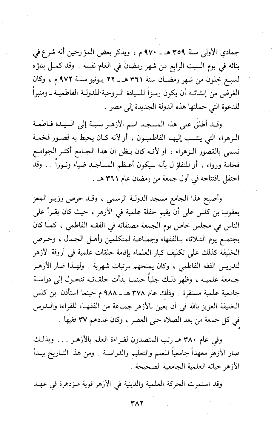 وفي عام 380 ه رتب المتصدون لقراءة العلم بالأزهر. . . وبذلك صار الأزهر معهدا جامعيا للعلم والتعليم والدراسة. ومن هذا التاريخ يبدأ الأزهر حياته العلمية الجامعية الصحيحة.