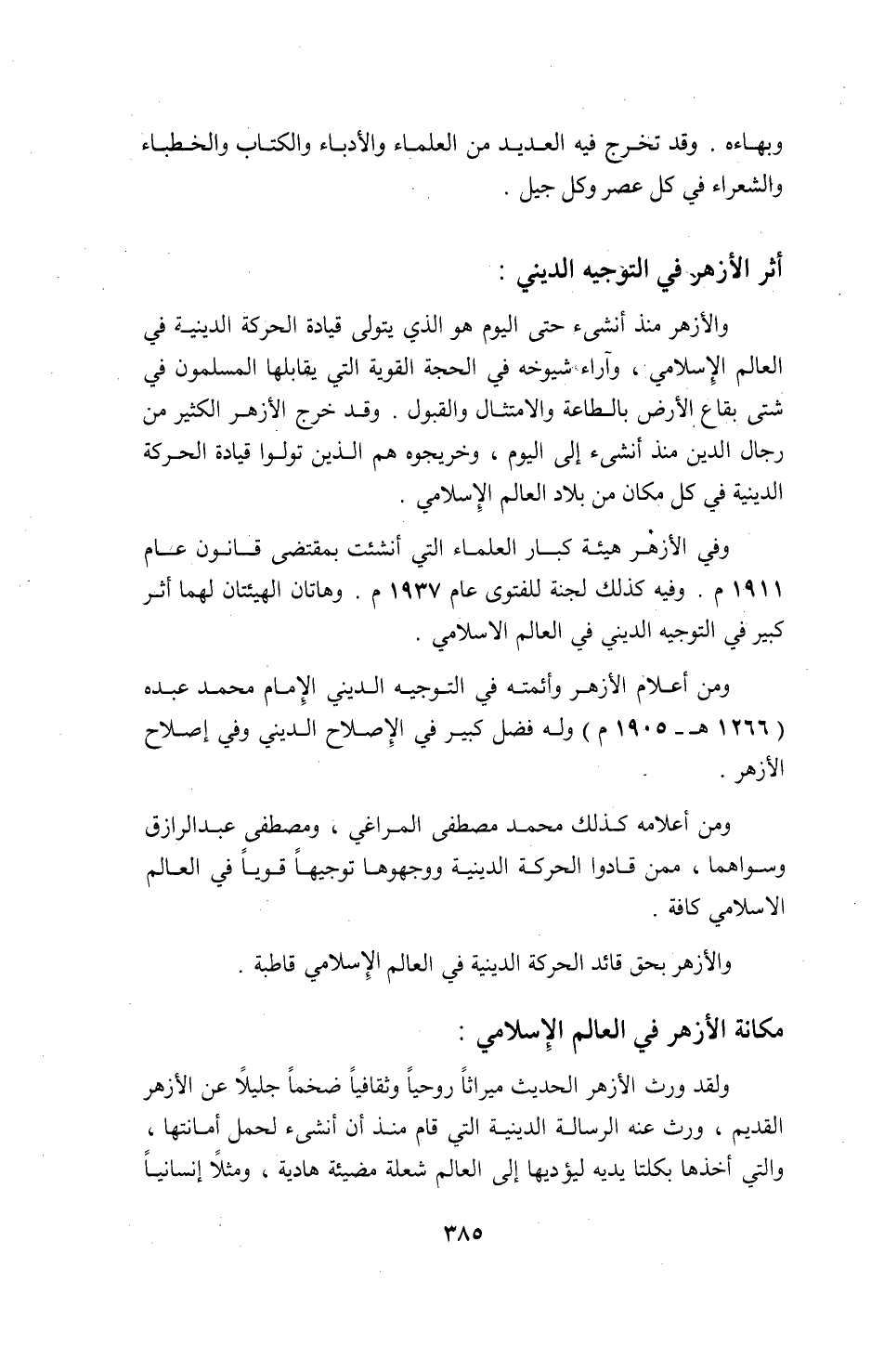 ومن أعلامه كذلك محمد مصطفى المراغي، ومصطفى عبد الرازق وسواهما، ممن قادوا الحركة الدينية ووجهوها توجيها قويا في العالم الاسلامي كافة.