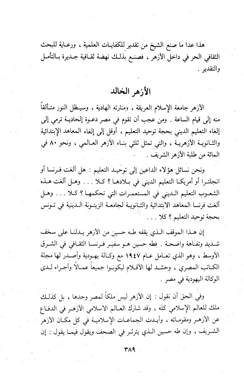 وفي الحق أن نقول: إن الأزهر ليس ملكا لمصر وحدها، بل كذلك ملك للعالم الإسلامي كله، وقد شارك العالم الاسلامي الأزهر في الدفاع عن الأزهر ومقوماته، وأيدت الجماعات الإسلامية في كل مكان الأزهر الشريف، وإن طه حسين الذي يثرثر في الصحف ويقول فيما يقول: إن