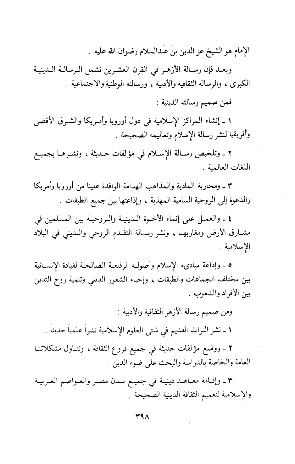 وبعد فإن رسالة الأزهر في القرن العشرين تشمل الرسالة الدينية الكبرى، والرسالة الثقافية والأدبية، ورسالته الوطنية والاجتماعية.