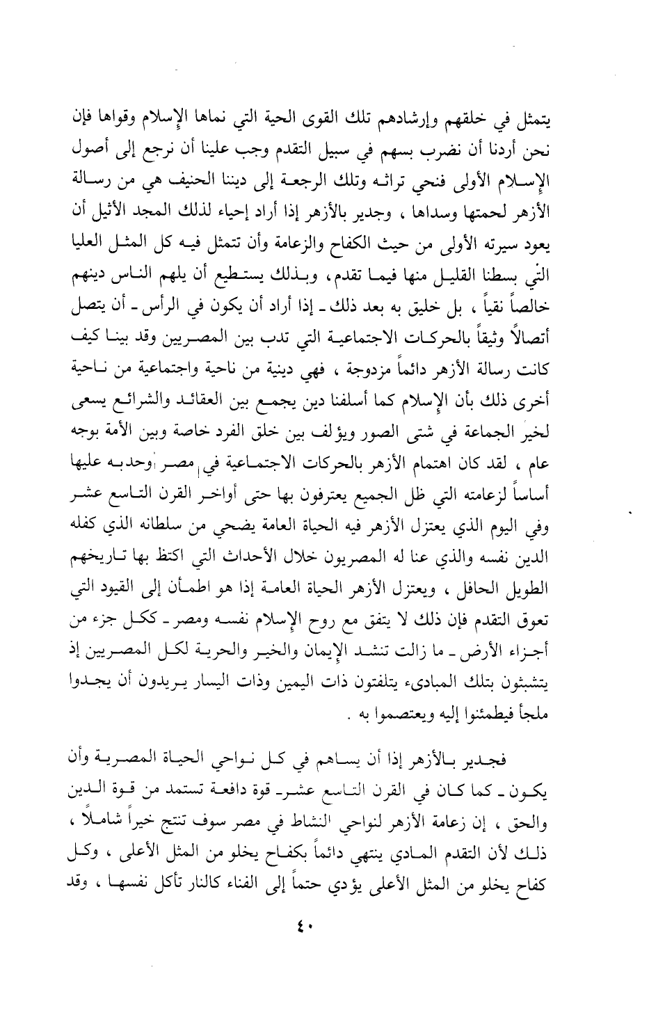فجدير بالأزهر إذا أن يساهم في كل نواحي الحياة المصرية وأن يكون-كما كان في القرن التاسع عشر-قوة دافعة تستمد من قوة الدين والحق، إن زعامة الأزهر لنواحي النشاط في مصر سوف تنتج خيرا شاملا، ذلك لأن التقدم المادي ينتهي دائما بكفاح يخلو من المثل الأعلى، وكل كفاح يخلو من المثل الأعلى يؤدي حتما إلى الفناء كالنار تأكل نفسها، وقد
