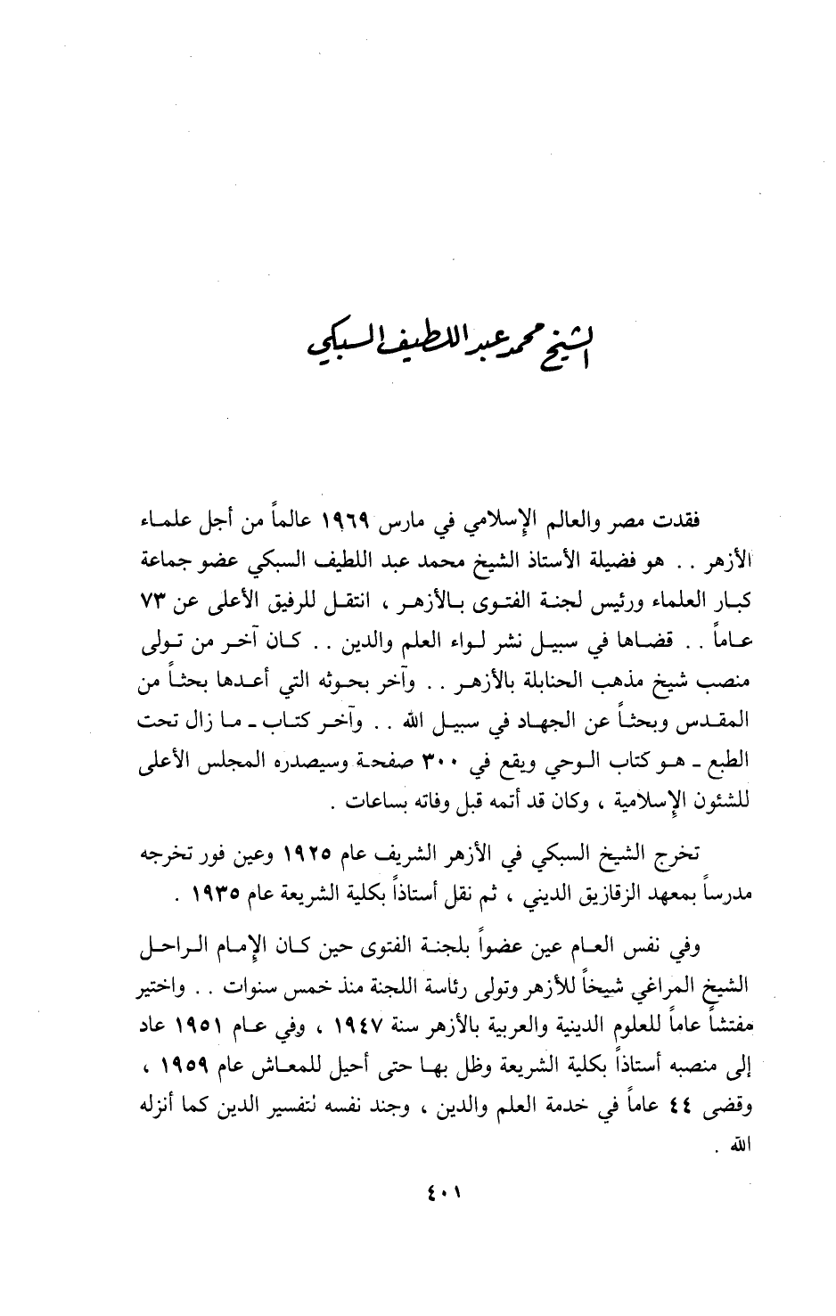 فقدت مصر والعالم الإسلامي في مارس 1969 عالما من أجل علماء الأزهر. . هو فضيلة الأستاذ الشيخ محمد عبد اللطيف السبكي عضو جماعة كبار العلماء ورئيس لجنة الفتوى بالأزهر، انتقل للرفيق الأعلى عن 73 عاما. . قضاها في سبيل نشر لواء العلم والدين. . كان آخر من تولى منصب شيخ مذهب الحنابلة بالأزهر. . وآخر بحوثه التي أعدها بحثا من المقدس وبحثا عن الجهاد في سبيل اللّه. . وآخر كتاب-ما زال تحت الطبع-هو كتاب الوحي ويقع في 300 صفحة وسيصدره المجلس الأعلى للشئون الإسلامية، وكان قد أتمه قبل وفاته بساعات.