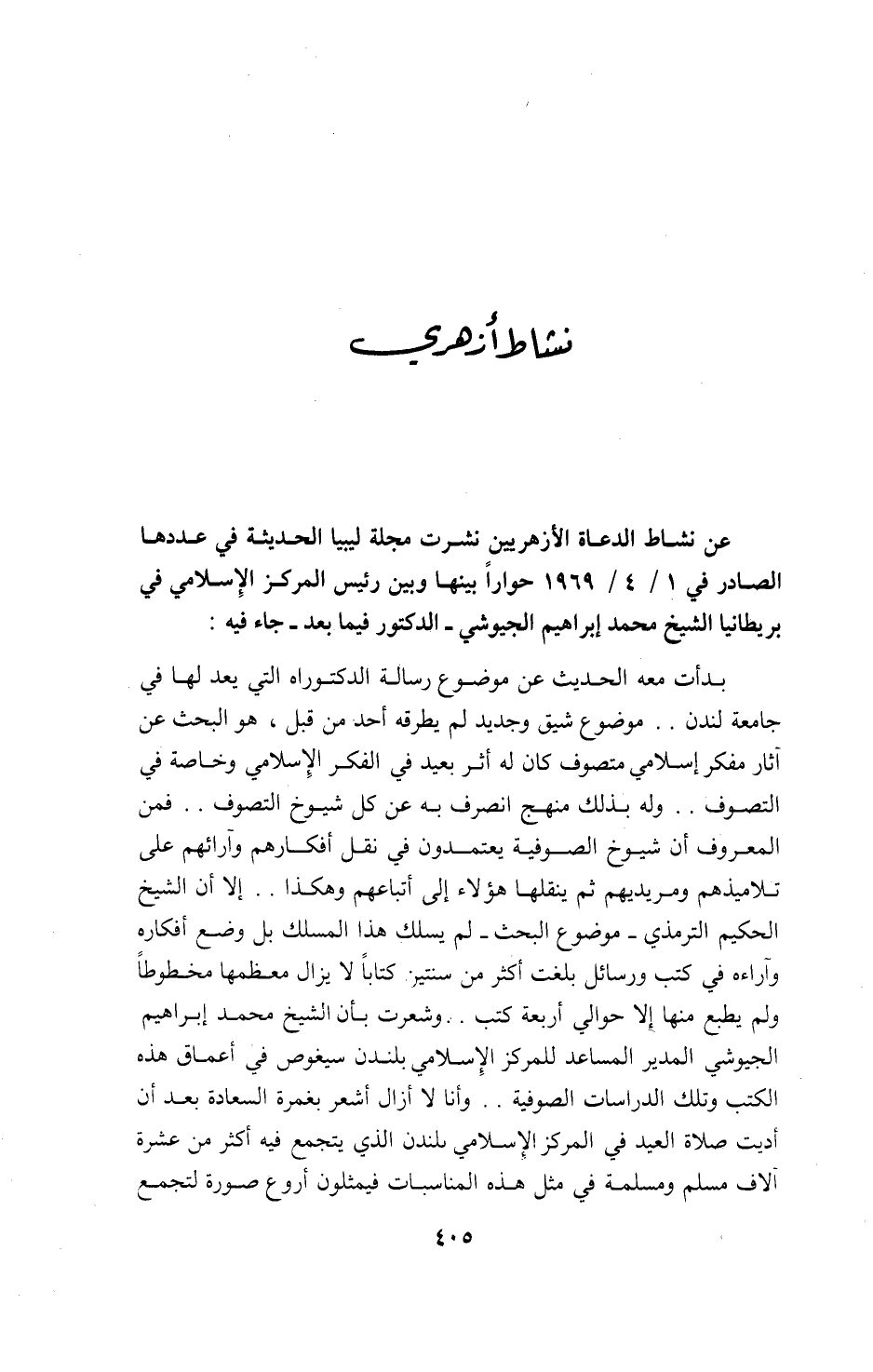 عن نشاط الدعاة الأزهريين نشرت مجلة ليبيا الحديثة في عددها الصادر في 1/ 4 / 1969 حوارا بينها وبين رئيس المركز الإسلامي في بريطانيا الشيخ محمد إبراهيم الجيوشي-الدكتور فيما بعد-جاء فيه: