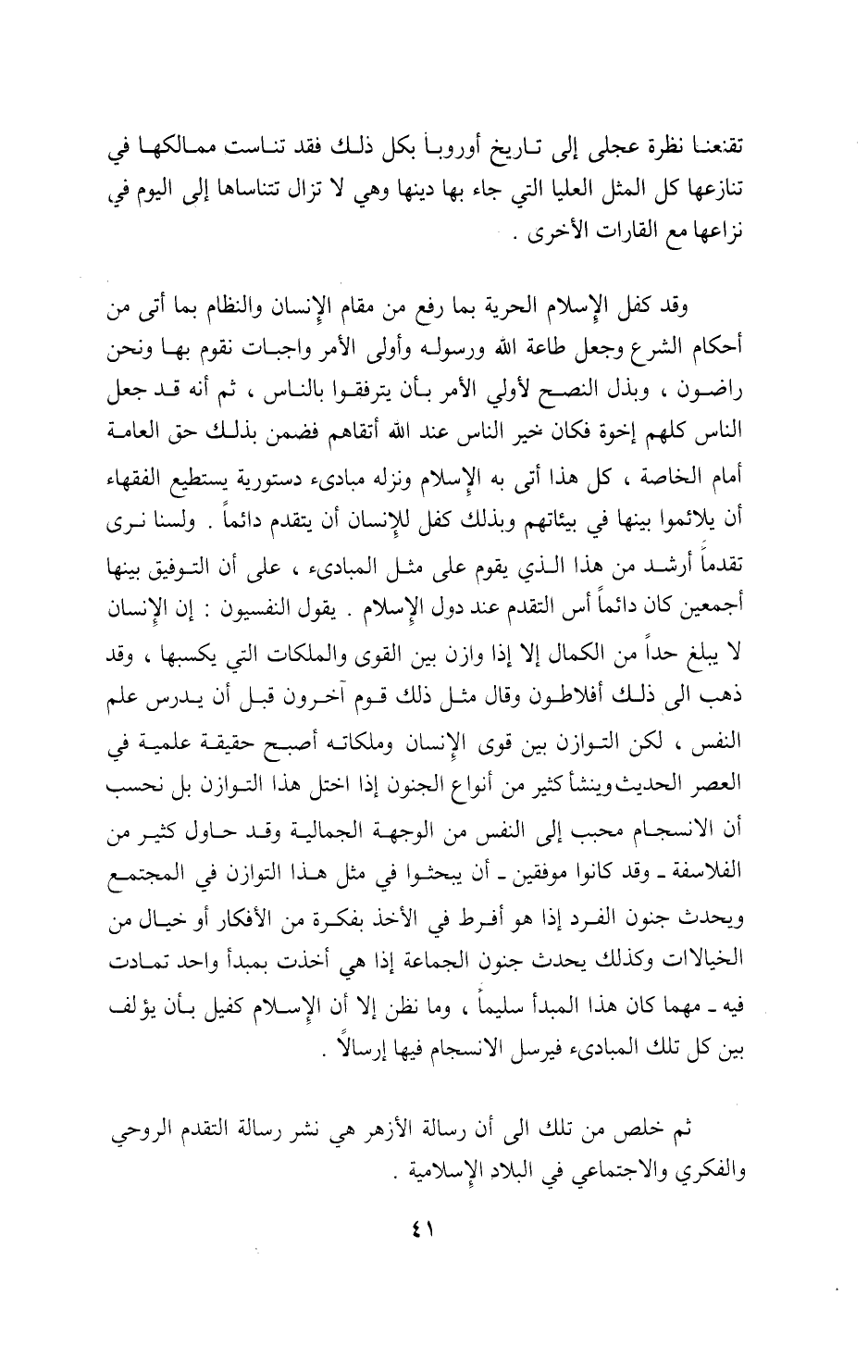 ثم خلص من تلك الى أن رسالة الأزهر هي نشر رسالة التقدم الروحي والفكري والاجتماعي في البلاد الإسلامية.