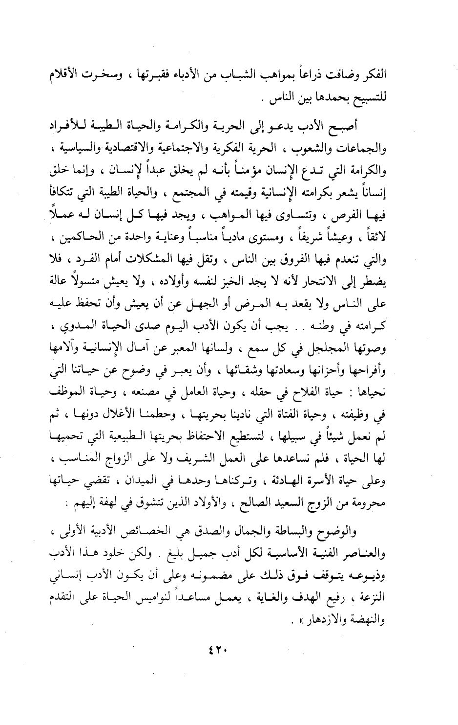 والوضوح والبساطة والجمال والصدق هي الخصائص الأدبية الأولى، والعناصر الفنية الأساسية لكل أدب جميل بليغ. ولكن خلود هذا الأدب وذيوعه يتوقف فوق ذلك على مضمونه وعلى أن يكون الأدب إنساني النزعة، رفيع الهدف والغاية، يعمل مساعدا لنواميس الحياة على التقدم والنهضة والازدهار».