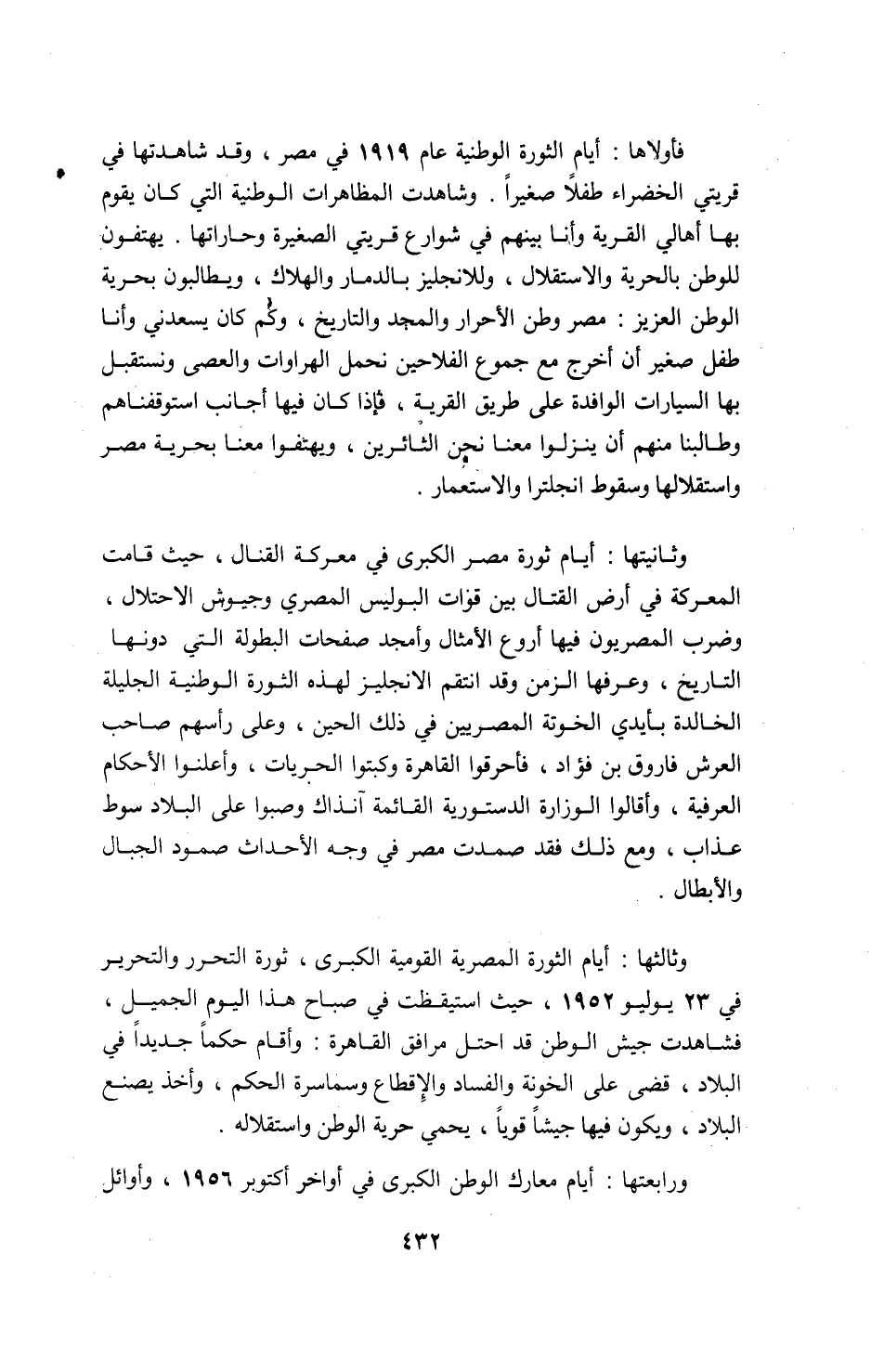 وثالثها: أيام الثورة المصرية القومية الكبرى، ثورة التحرر والتحرير في 23 يوليو 1952، حيث استيقظت في صباح هذا اليوم الجميل، فشاهدت جيش الوطن قد احتل مرافق القاهرة: وأقام حكما جديدا في البلاد، قضى على الخونة والفساد والإقطاع وسماسرة الحكم، وأخذ يصنع البلاد، ويكون فيها جيشا قويا، يحمي حرية الوطن واستقلاله.