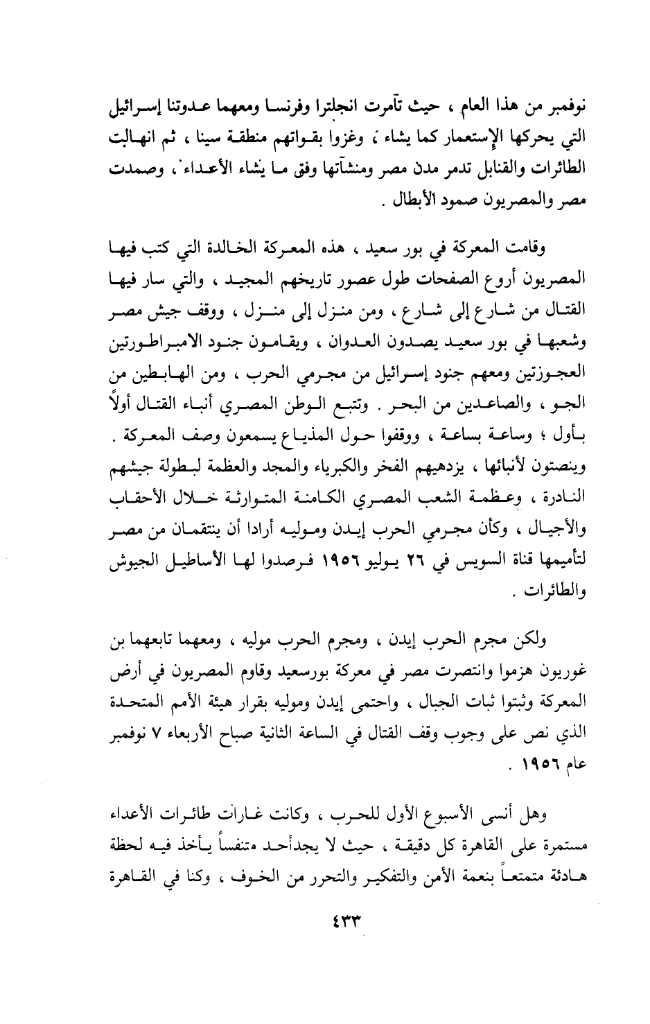 وينصتون لأنبائها، يزدهيهم الفخر والكبرياء والمجد والعظمة لبطولة جيشهم النادرة، وعظمة الشعب المصري الكامنة المتوارثة خلال الأحقاب والأجيال، وكأن مجرمي الحرب إيدن وموليه أرادا أن ينتقمان من مصر لتأميمها قناة السويس في 26 يوليو 1956 فرصدوا لها الأساطيل الجيوش والطائرات.