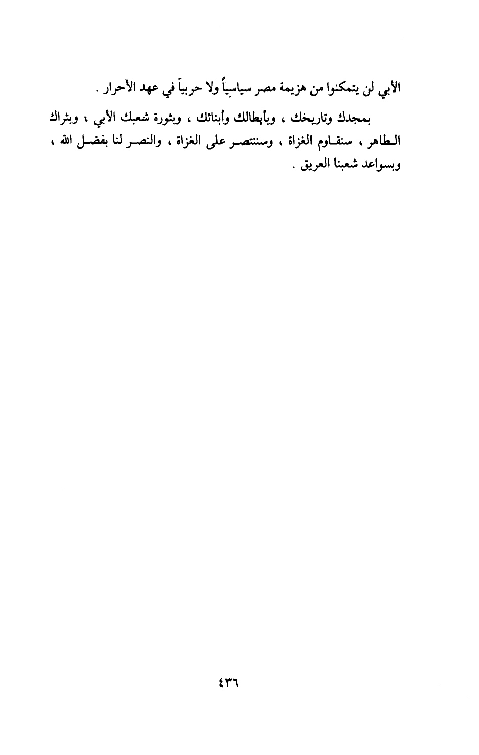 بمجدك وتاريخك، وبأبطالك وأبنائك، وبثورة شعبك الأبي، وبثراك الطاهر، سنقاوم الغزاة، وسننتصر على الغزاة، والنصر لنا بفضل اللّه، وبسواعد شعبنا العريق.