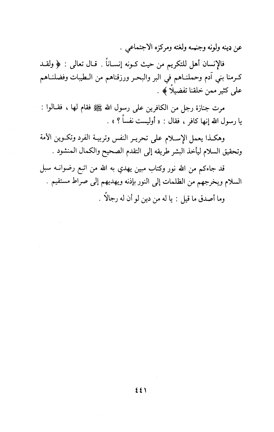 وهكذا يعمل الإسلام على تحرير النفس وتربية الفرد وتكوين الأمة وتحقيق السلام ليأخذ البشر طريقه إلى التقدم الصحيح والكمال المنشود.