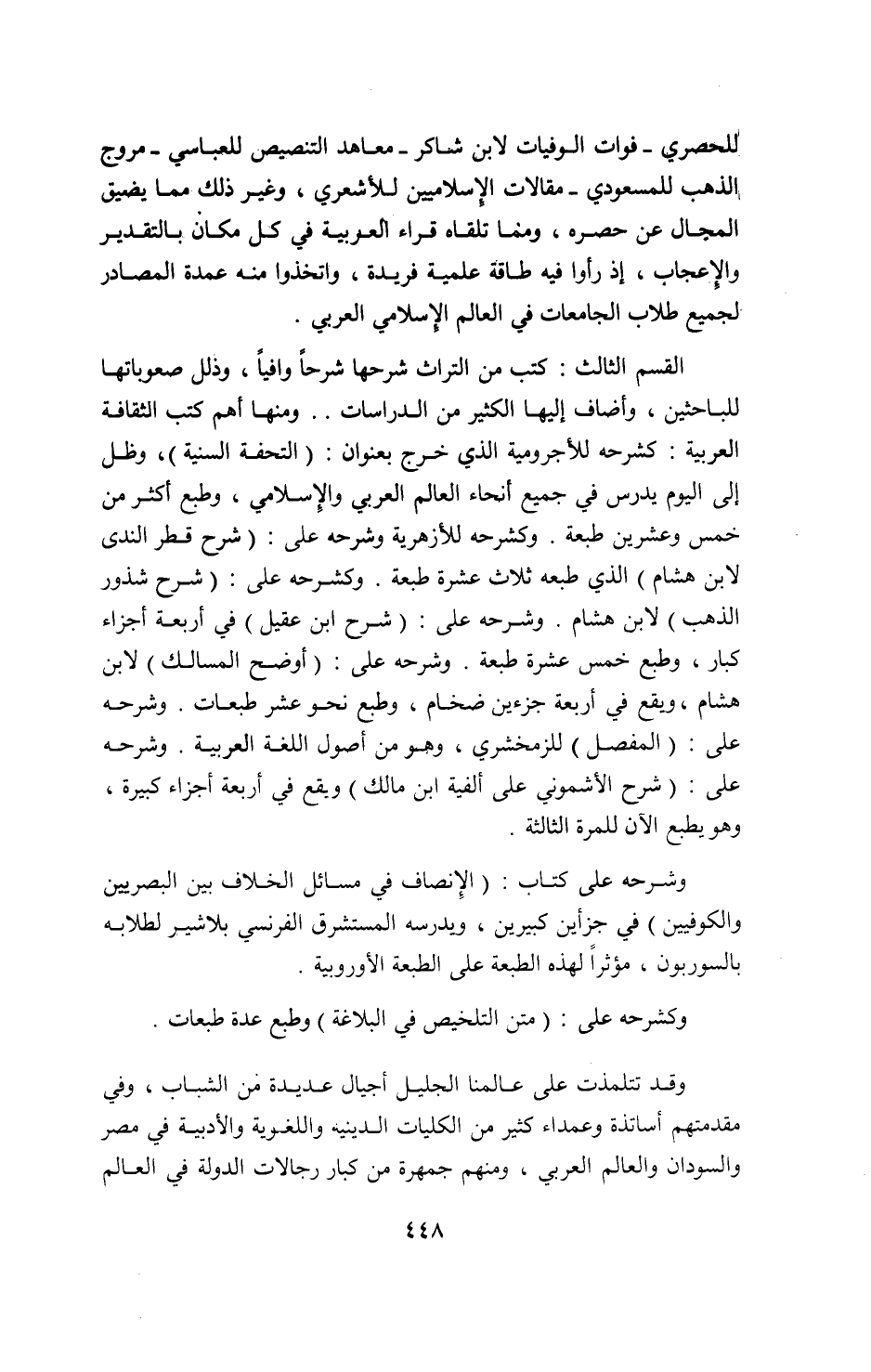 القسم الثالث: كتب من التراث شرحها شرحا وافيا، وذلل صعوباتها للباحثين، وأضاف إليها الكثير من الدراسات. . ومنها أهم كتب الثقافة العربية: كشرحه للأجرومية الذي خرج بعنوان: (التحفة السنية)، وظل إلى اليوم يدرس في جميع أنحاء العالم العربي والإسلامي، وطبع أكثر من خمس وعشرين طبعة. وكشرحه للأزهرية وشرحه على: (شرح قطر الندى لابن هشام) الذي طبعه ثلاث عشرة طبعة. وكشرحه على: (شرح شذور الذهب) لابن هشام. وشرحه على: (شرح ابن عقيل) في أربعة أجزاء كبار، وطبع خمس عشرة طبعة. وشرحه على: (أوضح المسالك) لابن هشام، ويقع في أربعة جزءين ضخام، وطبع نحو عشر طبعات. وشرحه على: (المفصل) للزمخشري، وهو من أصول اللغة العربية. وشرحه على: (شرح الأشموني على ألفية ابن مالك) ويقع في أربعة أجزاء كبيرة، وهو يطبع الآن للمرة الثالثة.