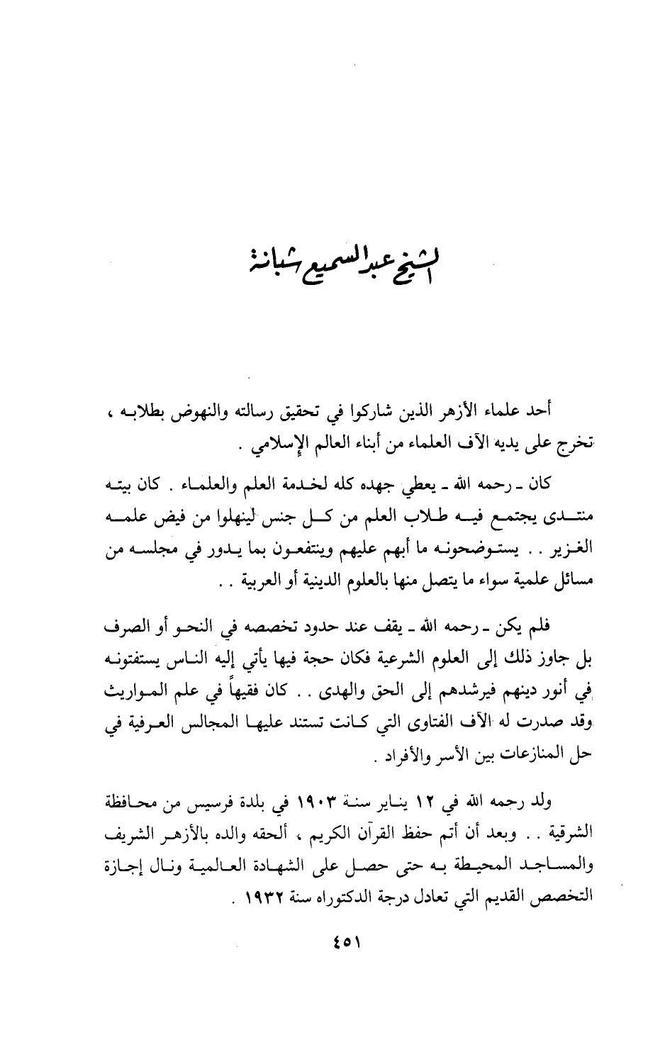ولد رحمه اللّه في 12 يناير سنة 1903 في بلدة فرسيس من محافظة الشرقية. . وبعد أن أتم حفظ القرآن الكريم، ألحقه والده بالأزهر الشريف والمساجد المحيطة به حتى حصل على الشهادة العالمية ونال إجازة التخصص القديم التي تعادل درجة الدكتوراه سنة 1932.