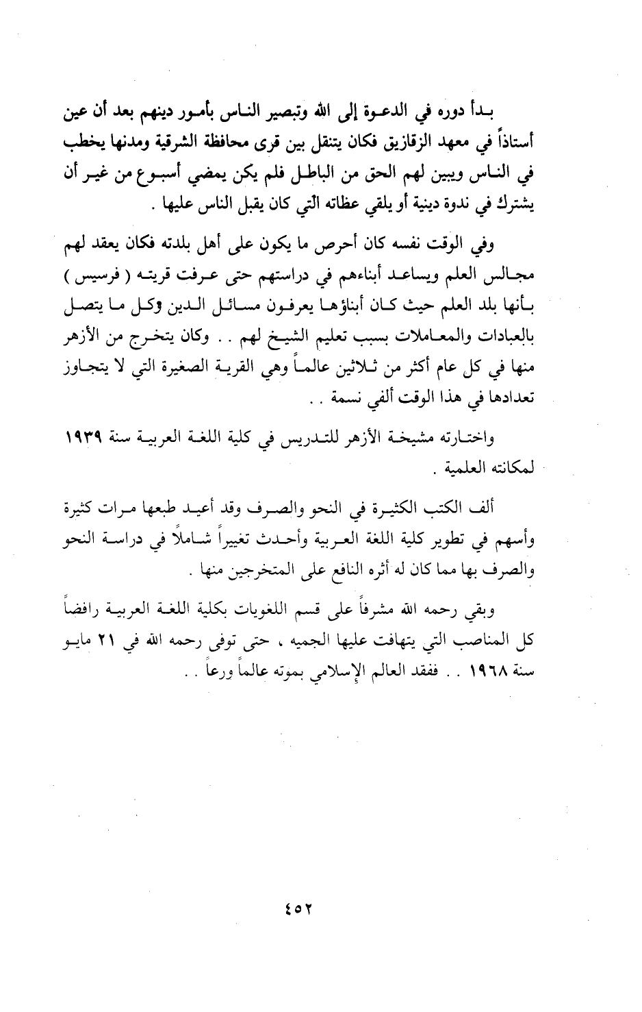 وبقي رحمه اللّه مشرفا على قسم اللغويات بكلية اللغة العربية رافضا كل المناصب التي يتهافت عليها الجميه، حتى توفى رحمه اللّه في 21 مايو سنة 1968. . ففقد العالم الإسلامي بموته عالما ورعا. .