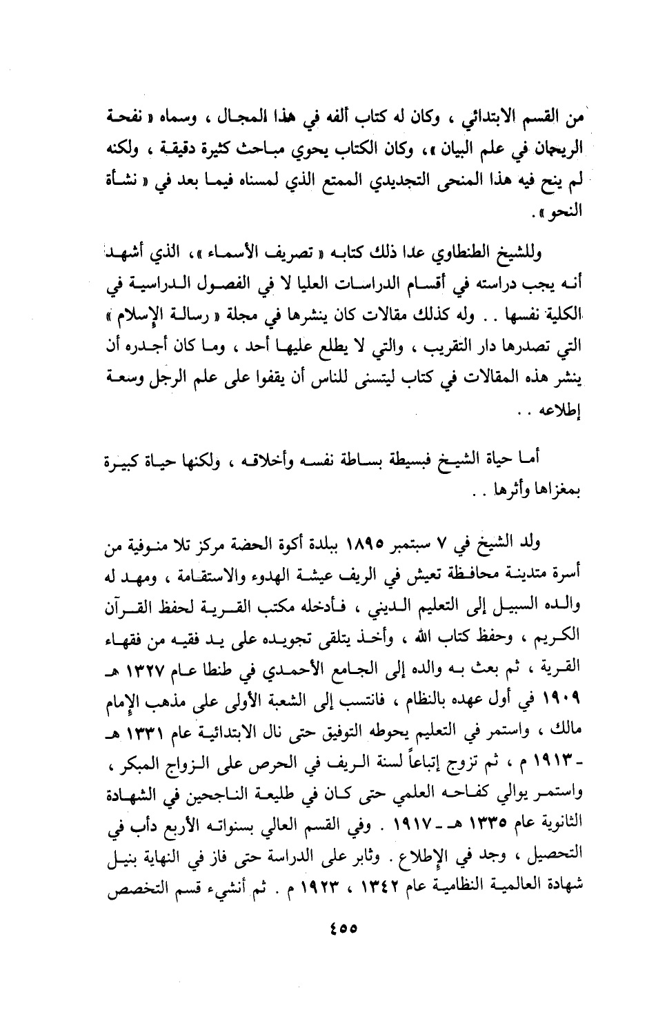 وللشيخ الطنطاوي عدا ذلك كتابه «تصريف الأسماء»، الذي أشهد أنه يجب دراسته في أقسام الدراسات العليا لا في الفصول الدراسية في الكلية نفسها. . وله كذلك مقالات كان ينشرها في مجلة «رسالة الإسلام» التي تصدرها دار التقريب، والتي لا يطلع عليها أحد، وما كان أجدره أن ينشر هذه المقالات في كتاب ليتسنى للناس أن يقفوا على علم الرجل وسعة إطلاعه. .