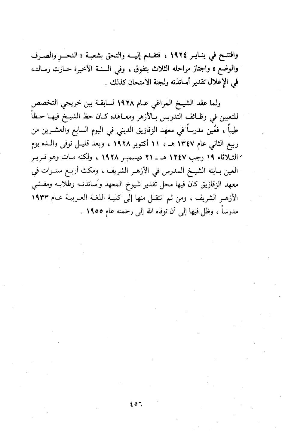 ولما عقد الشيخ المراغي عام 1928 لسابقة بين خريجي التخصص للتعيين في وظائف التدريس بالأزهر ومعاهده كان حظ الشيخ فيها حظا طيبا، فعين مدرسا في معهد الزقازيق الديني في اليوم السابع والعشرين من ربيع الثاني عام 1347 ه، 11 أكتوبر 1928، وبعد قليل توفى والده يوم الثلاثاء 19 رجب 1247 ه- 21 ديسمبر 1928، ولكنه مات وهو قرير العين بابنه الشيخ المدرس في الأزهر الشريف، ومكث أربع سنوات في معهد الزقازيق كان فيها محل تقدير شيوخ المعهد وأساتذته وطلابه ومفتشي الأزهر الشريف، ومن ثم انتقل منها إلى كلية اللغة العربية عام 1933 مدرسا، وظل فيها إلى أن توفاه اللّه إلى رحمته عام 1955.