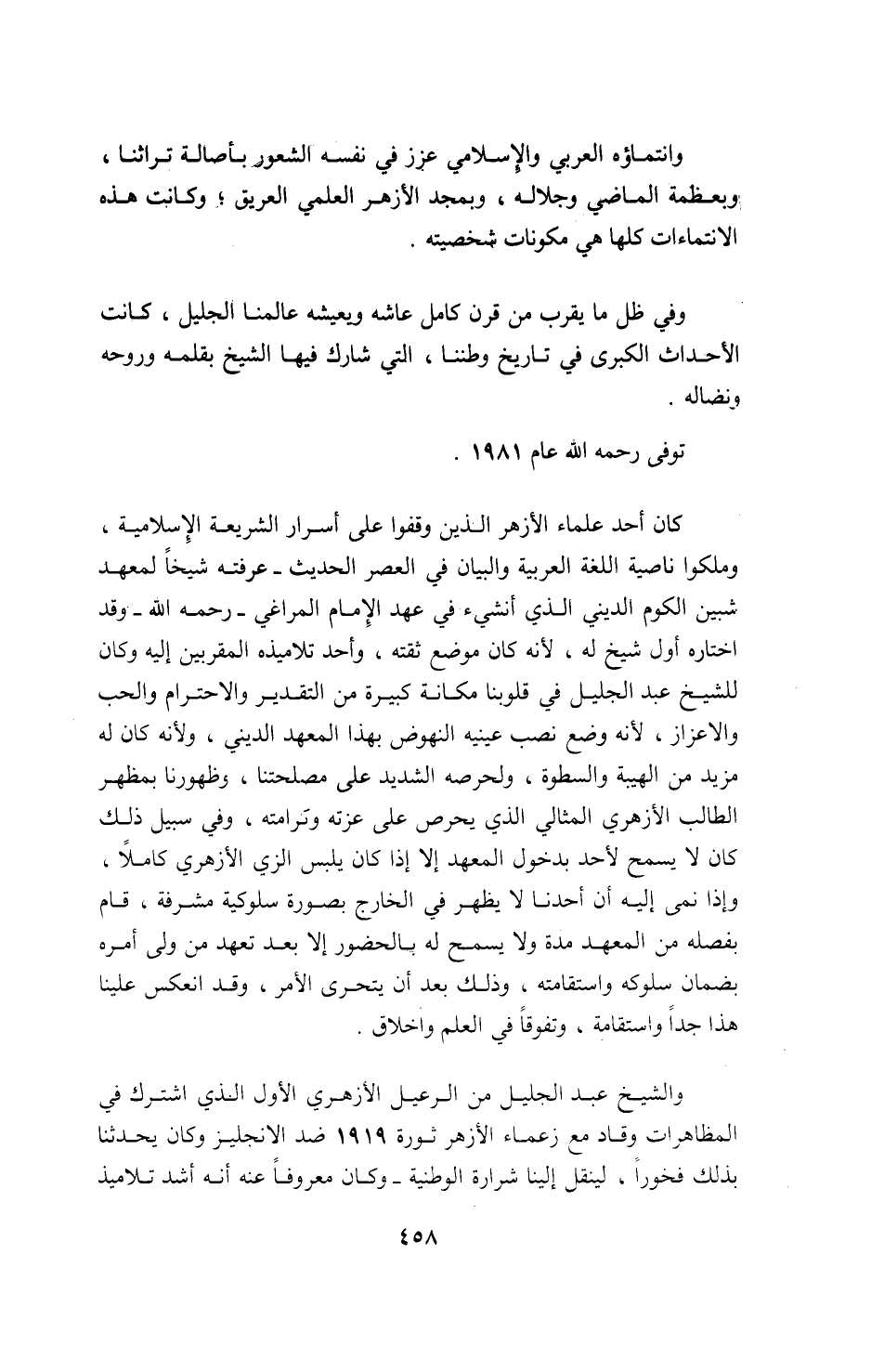 والشيخ عبد الجليل من الرعيل الأزهري الأول الذي اشترك في المظاهرات وقاد مع زعماء الأزهر ثورة 1919 ضد الانجليز وكان يحدثنا بذلك فخورا، لينقل إلينا شرارة الوطنية-و كان معروفا عنه أنه أشد تلاميذ