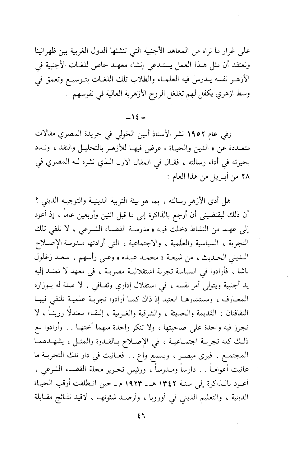 وفي عام 1952 نشر الأستاذ أمين الخولي في جريدة المصري مقالات متعددة عن «الدين والحياة» عرض فيها للأزهر بالتحليل والنقد، وندد بحيرته في أداء رسالته، فقال في المقال الأول الذي نشره له المصري في 28 من أبريل من هذا العام: