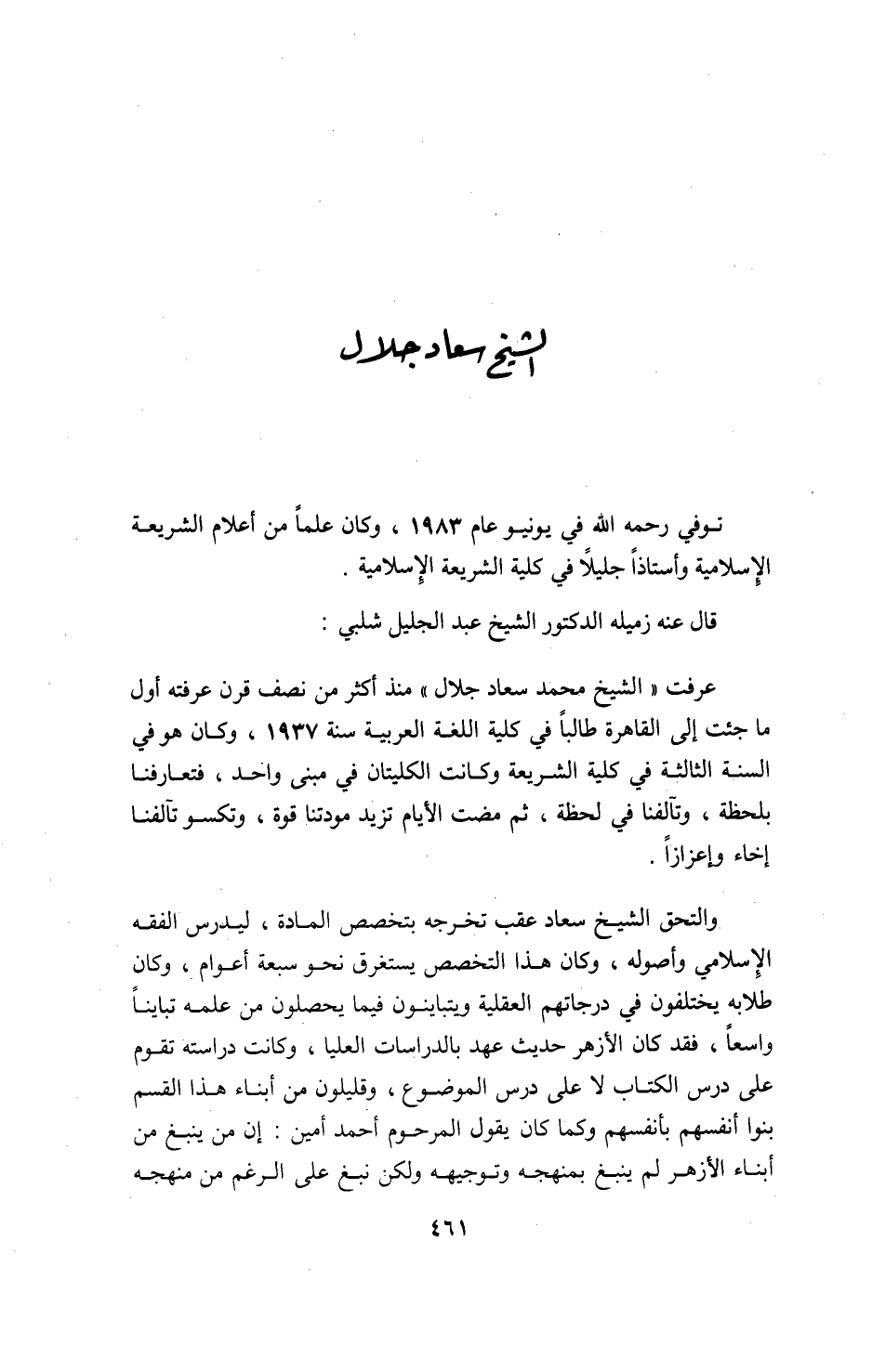 عرفت «الشيخ محمد سعاد جلال» منذ أكثر من نصف قرن عرفته أول ما جئت إلى القاهرة طالبا في كلية اللغة العربية سنة 1937، وكان هو في السنة الثالثة في كلية الشريعة وكانت الكليتان في مبنى واحد، فتعارفنا بلحظة، وتآلفنا في لحظة، ثم مضت الأيام تزيد مودتنا قوة، وتكسو تآلفنا إخاء وإعزازا.