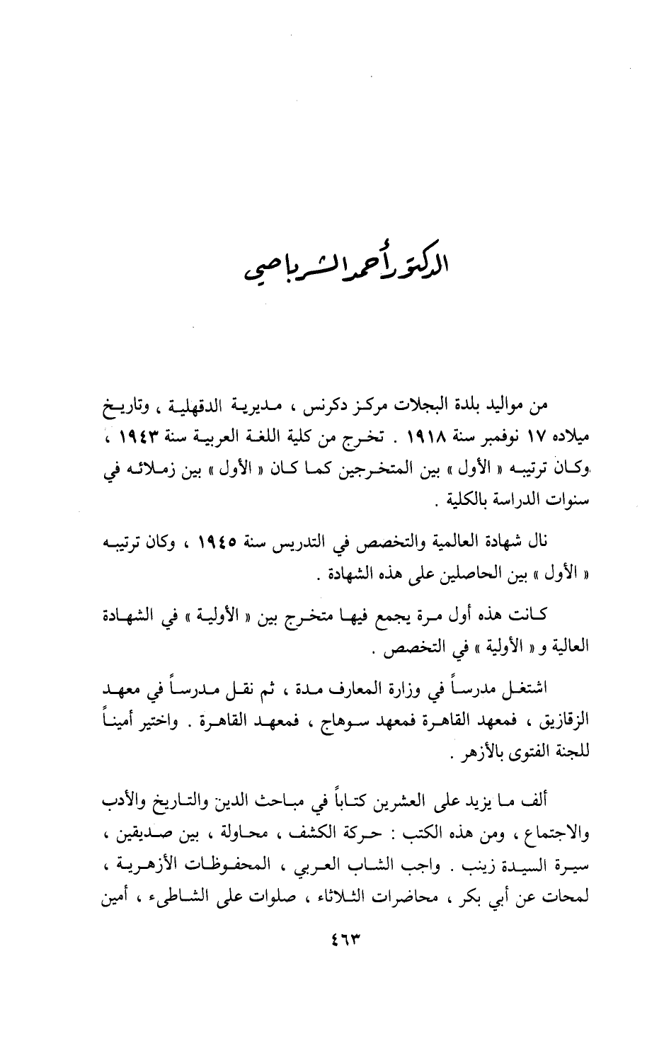 من مواليد بلدة البجلات مركز دكرنس، مديرية الدقهلية، وتاريخ ميلاده 17 نوفمبر سنة 1918. تخرج من كلية اللغة العربية سنة 1943، وكان ترتيبه «الأول» بين المتخرجين كما كان «الأول» بين زملائه في سنوات الدراسة بالكلية.