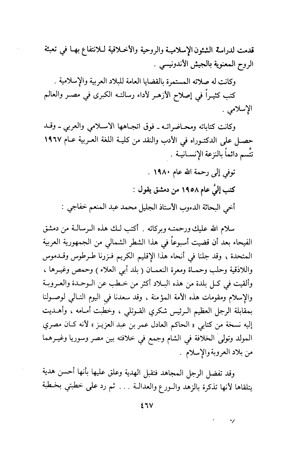سلام اللّه عليك ورحمته وبركاته. أكتب لك هذه الرسالة من دمشق الفيحاء بعد أن قضيت أسبوعا في هذا الشطر الشمالي من الجمهورية العربية المتحدة، وقد جلنا في أنحاء هذا الإقليم الكريم فزرنا طرطوس وقدموس واللاذقية وحلب وحماة ومعرة النعمان (بلد أبي العلاء) وحمص وغيرها، وألقيت في كل بلدة من هذه البلاد أكثر من خطب عن الوحدة والعروبة والإسلام ومقومات هذه الأمة المؤمنة، وقد سعدنا في اليوم التالي لوصولنا بمقابلة الرجل العظيم الرئيس شكري القوتلي، وخطبت أمامه، وأهديت إليه نسخة من كتابي «الحاكم العادل عمر بن عبد العزيز» لأنه كان مصري المولد وتولى الخلافة في الشام وجمع في خلافته بين مصر وسوريا وغيرهما من بلاد العروبة والإسلام.
