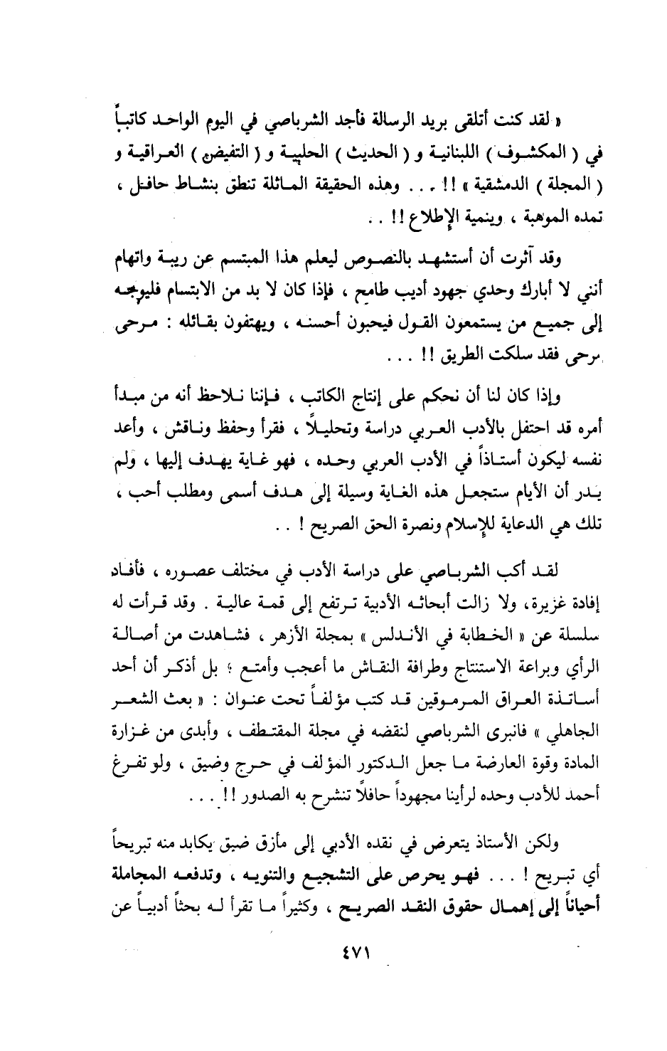 لقد أكب الشرباصي على دراسة الأدب في مختلف عصوره، فأفاد إفادة غزيرة، ولا زالت أبحاثه الأدبية ترتفع إلى قمة عالية. وقد قرأت له سلسلة عن «الخطابة في الأندلس» بمجلة الأزهر، فشاهدت من أصالة الرأي وبراعة الاستنتاج وطرافة النقاش ما أعجب وأمتع؛ بل أذكر أن أحد أساتذة العراق المرموقين قد كتب مؤلفا تحت عنوان: «بعث الشعر الجاهلي» فانبرى الشرباصي لنقضه في مجلة المقتطف، وأبدى من غزارة المادة وقوة العارضة ما جعل الدكتور المؤلف في حرج وضيق، ولو تفرغ أحمد للأدب وحده لرأينا مجهودا حافلا تنشرح به الصدور!!. . .