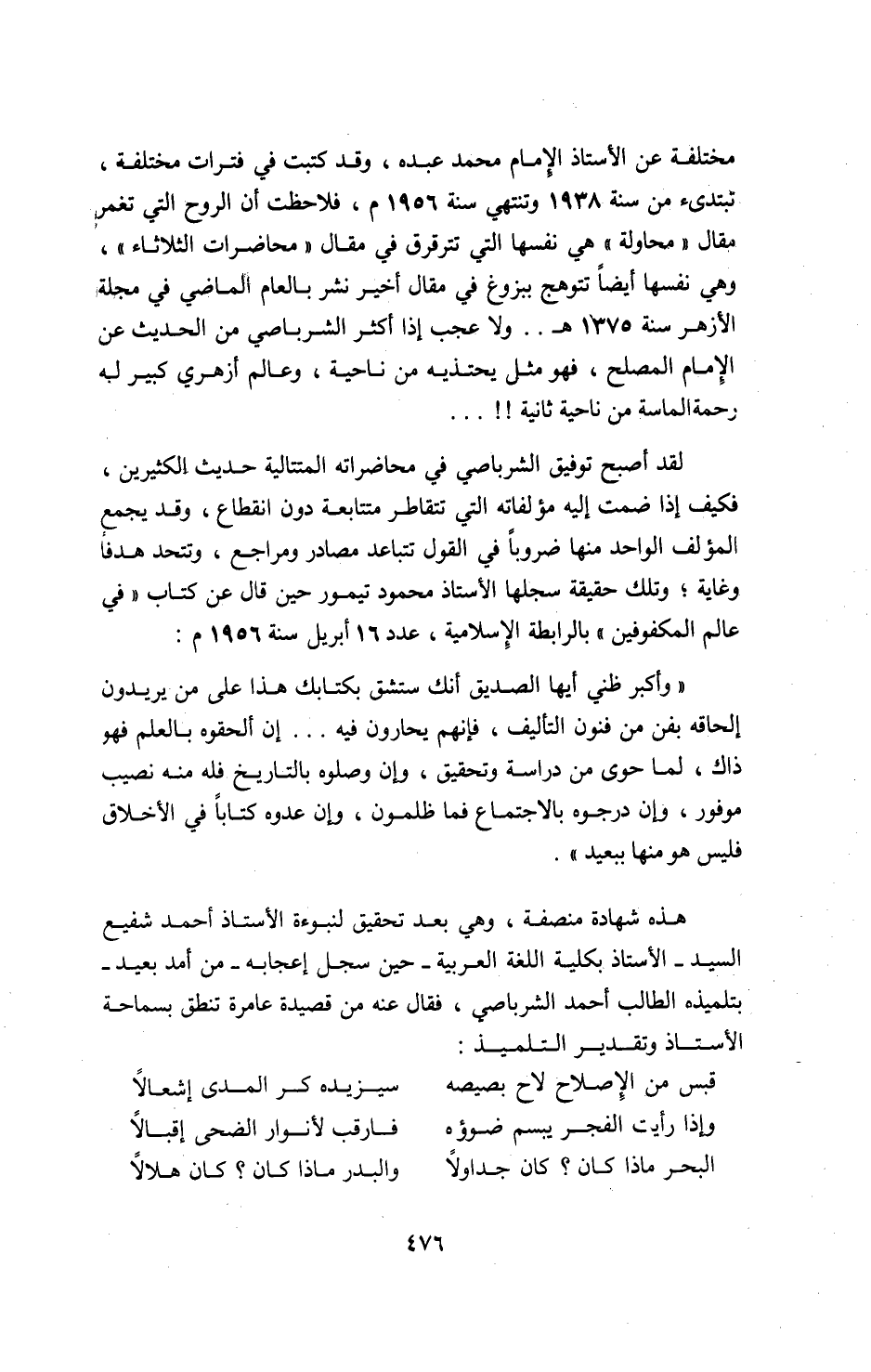 مختلفة عن الأستاذ الإمام محمد عبده، وقد كتبت في فترات مختلفة، تبتدىء من سنة 1938 وتنتهي سنة 1956 م، فلاحظت أن الروح التي تغمر مقال «محاولة» هي نفسها التي تترقرق في مقال «محاضرات الثلاثاء»، وهي نفسها أيضا تتوهج ببزوغ في مقال أخير نشر بالعام الماضي في مجلة الأزهر سنة 1375 ه. . ولا عجب إذا أكثر الشرباصي من الحديث عن الإمام المصلح، فهو مثل يحتذيه من ناحية، وعالم أزهري كبير له رحمة الماسة من ناحية ثانية!!. . .