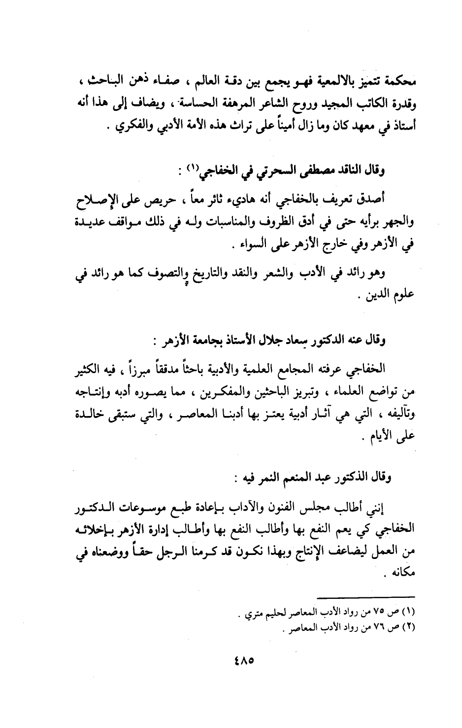 إنني أطالب مجلس الفنون والآداب بإعادة طبع موسوعات الدكتور الخفاجي كي يعم النفع بها وأطالب النفع بها وأطالب إدارة الأزهر بإخلائه من العمل ليضاعف الإنتاج وبهذا نكون قد كرمنا الرجل حقا ووضعناه في مكانه.