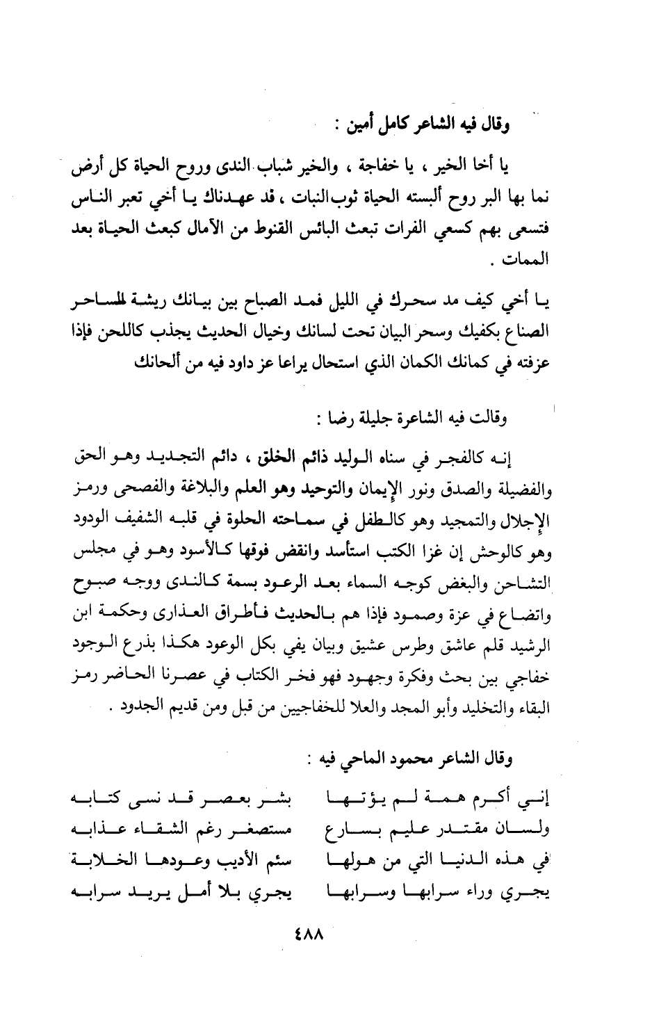 إنه كالفجر في سناه الوليد ذائم الخلق، دائم التجديد وهو الحق والفضيلة والصدق ونور الإيمان والتوحيد وهو العلم والبلاغة والفصحى ورمز الإجلال والتمجيد وهو كالطفل في سماحته الحلوة في قلبه الشفيف الودود وهو كالوحش إن غزا الكتب استأسد وانقض فوقها كالأسود وهو في مجلس التشاحن والبغض كوجه السماء بعد الرعود بسمة كالندى ووجه صبوح واتضاع في عزة وصمود فإذا هم بالحديث فأطراق العذارى وحكمة ابن الرشيد قلم عاشق وطرس عشيق وبيان يفي بكل الوعود هكذا بذرع الوجود خفاجي بين بحث وفكرة وجهود فهو فخر الكتاب في عصرنا الحاضر رمز البقاء والتخليد وأبو المجد والعلا للخفاجيين من قبل ومن قديم الجدود.