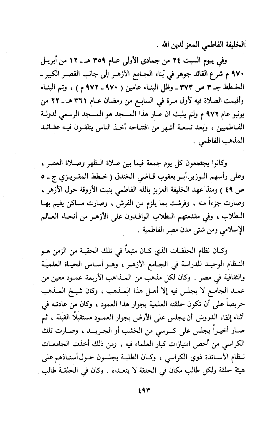 وكان نظام الحلقات الذي كان متبعا في تلك الحقبة من الزمن هو النظام الوحيد للدراسة في الجامع الأزهر، وهو أساس الحياة العلمية والثقافية في مصر. وكان لكل مذهب من المذاهب الأربعة عمود معين من عمد الجامع لا يجلس فيه إلا أهل هذا المذهب، وكان شيخ المذهب حريصا على أن تكون حلقته العلمية بجوار هذا العمود، وكان من عادته في أثناء إلقاء الدروس أن يجلس على الأرض بجوار العمود مستقبلا القبلة، ثم صار أخيرا يجلس على كرسي من الخشب أو الجريد، وصارت تلك الكراسي من أخص امتيازات كبار العلماء فيه، ومن ذلك أخذت الجامعات نظام الأساتذة ذوي الكراسي، وكان الطلبة يجلسون حول أستاذهم على هيئة حلقة ولكل طالب مكان في الحلقة لا يتعداه. وكان في الحلقة طالب