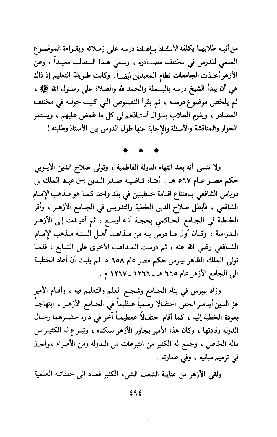ولا ننسى أنه بعد انتهاء الدولة الفاطمية، وتولى صلاح الدين الأيوبي حكم مصر عام 567 ه. أفتاه قاضيه صدر الدين بن عبد الملك بن درباس الشافعي بامتناع اقامة خطبتين في بلد واحد كما هو مذهب الإمام الشافعي، فأبطل صلاح الدين الخطبة والتدريس في الجامع الأزهر، وأقر الخطبة في الجامع الحاكمي بحجة أنه أوسع، ثم أعيدت إلى الأزهر الدراسة، وكان أول ما درس به من مذاهب أهل السنة مذهب الإمام الشافعي رضي اللّه عنه، ثم درست المذاهب الأخرى على التتابع، فلما تولى الملك الظاهر بيبرس حكم مصر عام 658 ه لم يلبث أن أعاد الخطبة الى الجامع الأزهر عام 665 ه- 1266 - 1267 م.