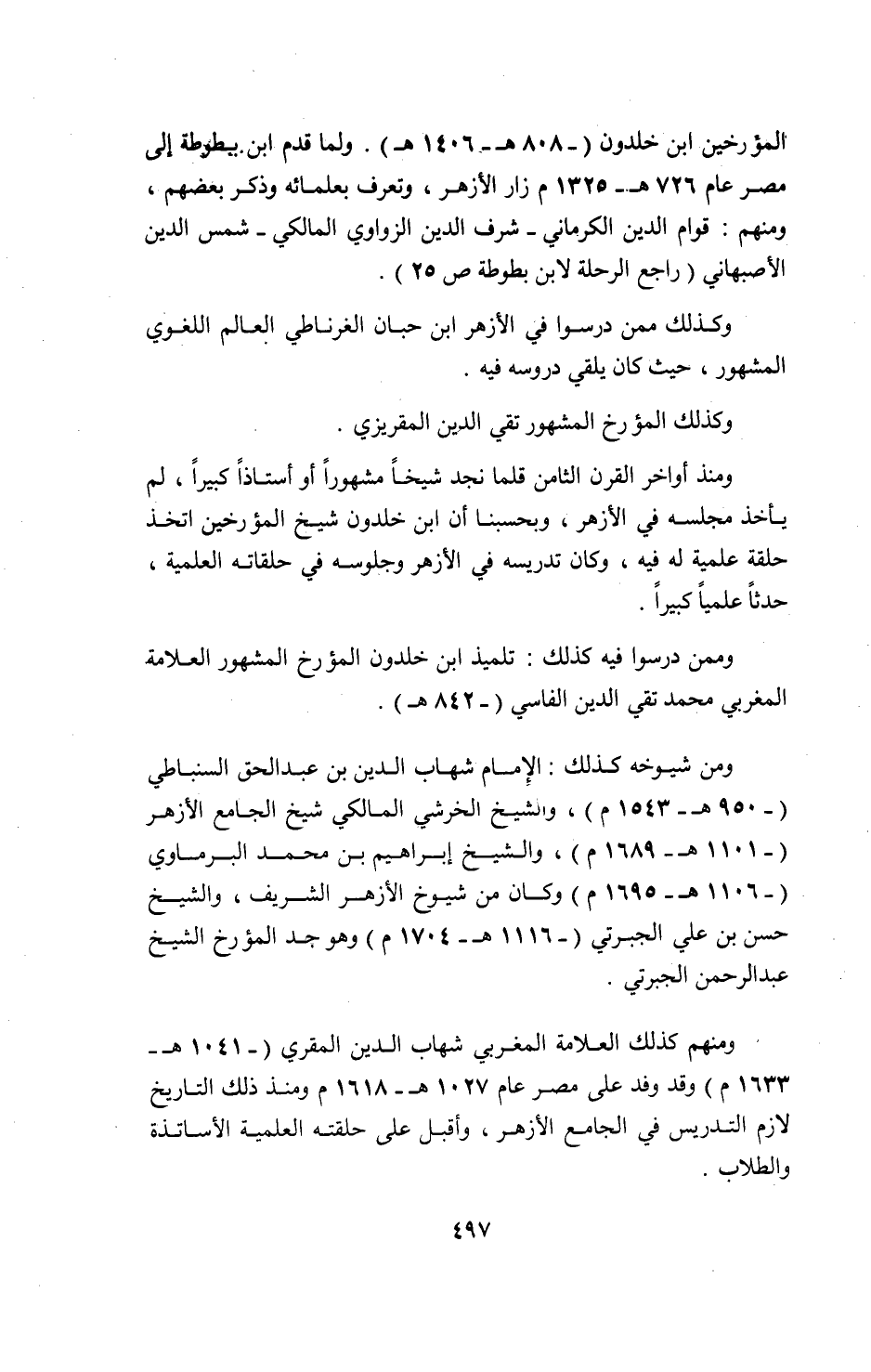 المؤرخين ابن خلدون (- 808 ه- 1406 ه). ولما قدم ابن بطوطة إلى مصر عام 726 ه- 1325 م زار الأزهر، وتعرف بعلمائه وذكر بعضهم، ومنهم: قوام الدين الكرماني-شرف الدين الزواوي المالكي-شمس الدين الأصبهاني (راجع الرحلة لابن بطوطة ص 25).