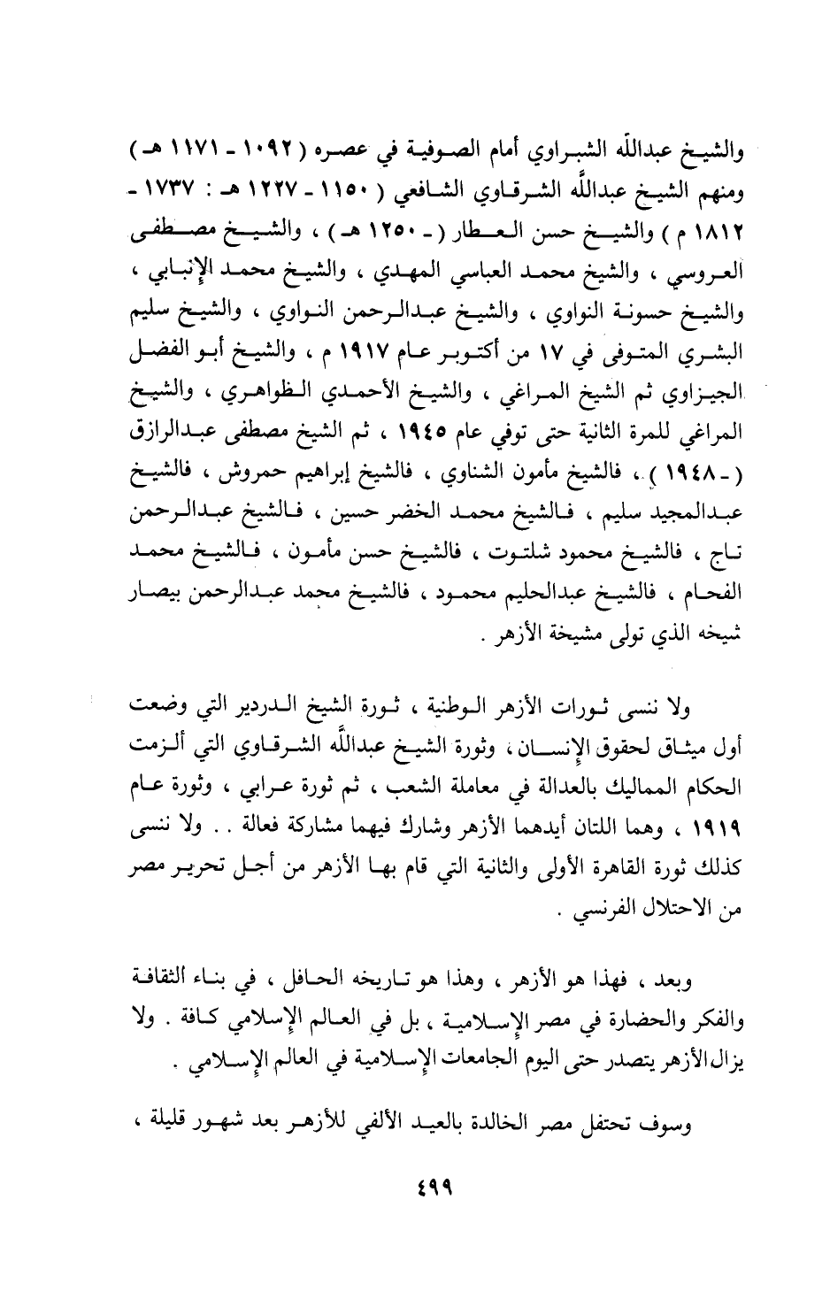 ولا ننسى ثورات الأزهر الوطنية، ثورة الشيخ الدردير التي وضعت أول ميثاق لحقوق الإنسان، وثورة الشيخ عبد اللّه الشرقاوي التي ألزمت الحكام المماليك بالعدالة في معاملة الشعب، ثم ثورة عرابي، وثورة عام 1919، وهما اللتان أيدهما الأزهر وشارك فيهما مشاركة فعالة. . ولا ننسى كذلك ثورة القاهرة الأولى والثانية التي قام بها الأزهر من أجل تحرير مصر من الاحتلال الفرنسي.