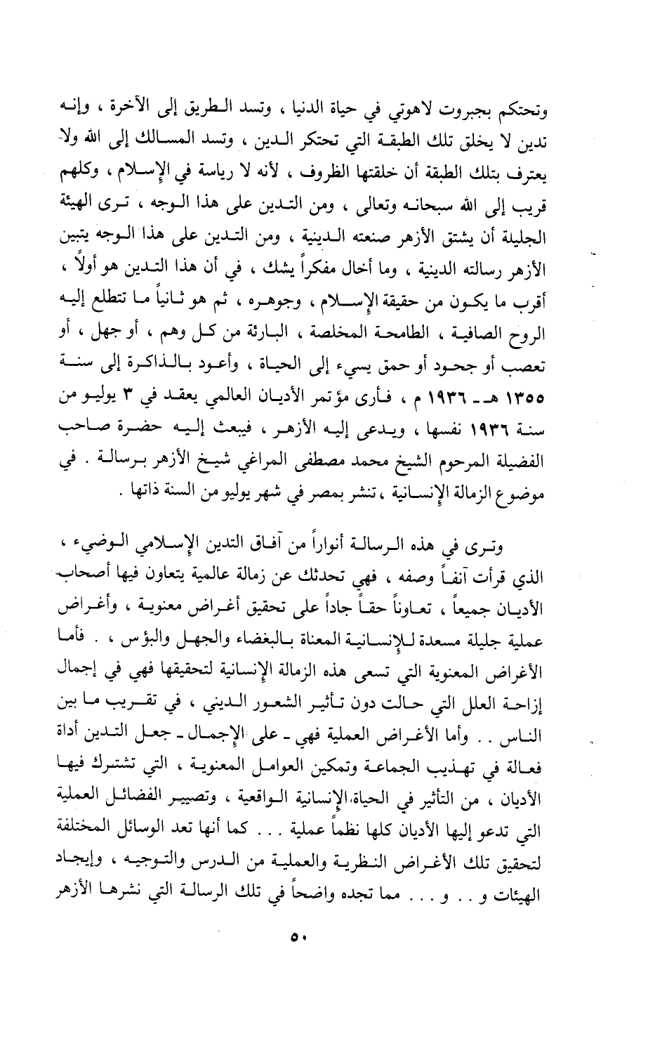 وتحتكم بجبروت لاهوتي في حياة الدنيا، وتسد الطريق إلى الآخرة، وإنه تدين لا يخلق تلك الطبقة التي تحتكر الدين، وتسد المسالك إلى اللّه ولا يعترف بتلك الطبقة أن خلقتها الظروف، لأنه لا رياسة في الإسلام، وكلهم قريب إلى اللّه سبحانه وتعالى، ومن التدين على هذا الوجه، ترى الهيئة الجليلة أن يشتق الأزهر صنعته الدينية، ومن التدين على هذا الوجه يتبين الأزهر رسالته الدينية، وما أخال مفكرا يشك، في أن هذا التدين هو أولا، أقرب ما يكون من حقيقة الإسلام، وجوهره، ثم هو ثانيا ما تتطلع إليه الروح الصافية، الطامحة المخلصة، البارئة من كل وهم، أو جهل، أو تعصب أو جحود أو حمق يسيء إلى الحياة، وأعود بالذاكرة إلى سنة 1355 ه- 1936 م، فأرى مؤتمر الأديان العالمي يعقد في 3 يوليو من سنة 1936 نفسها، ويدعى إليه الأزهر، فيبعث إليه حضرة صاحب الفضيلة المرحوم الشيخ محمد مصطفى المراغي شيخ الأزهر برسالة. في موضوع الزمالة الإنسانية، تنشر بمصر في شهر يوليو من السنة ذاتها.
