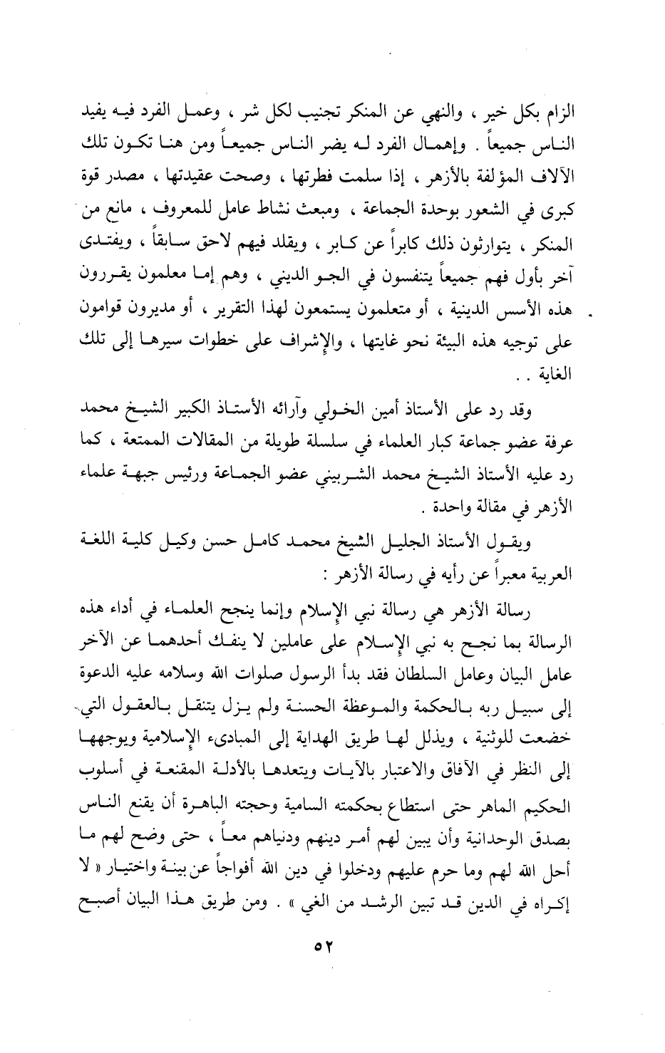 الزام بكل خير، والنهي عن المنكر تجنيب لكل شر، وعمل الفرد فيه يفيد الناس جميعا. وإهمال الفرد له يضر الناس جميعا ومن هنا تكون تلك الآلاف المؤلفة بالأزهر، إذا سلمت فطرتها، وصحت عقيدتها، مصدر قوة كبرى في الشعور بوحدة الجماعة، ومبعث نشاط عامل للمعروف، مانع من المنكر، يتوارثون ذلك كابرا عن كابر، ويقلد فيهم لاحق سابقا، ويفتدى آخر بأول فهم جميعا يتنفسون في الجو الديني، وهم إما معلمون يقررون هذه الأسس الدينية، أو متعلمون يستمعون لهذا التقرير، أو مديرون قوامون على توجيه هذه البيئة نحو غايتها، والإشراف على خطوات سيرها إلى تلك الغاية. .