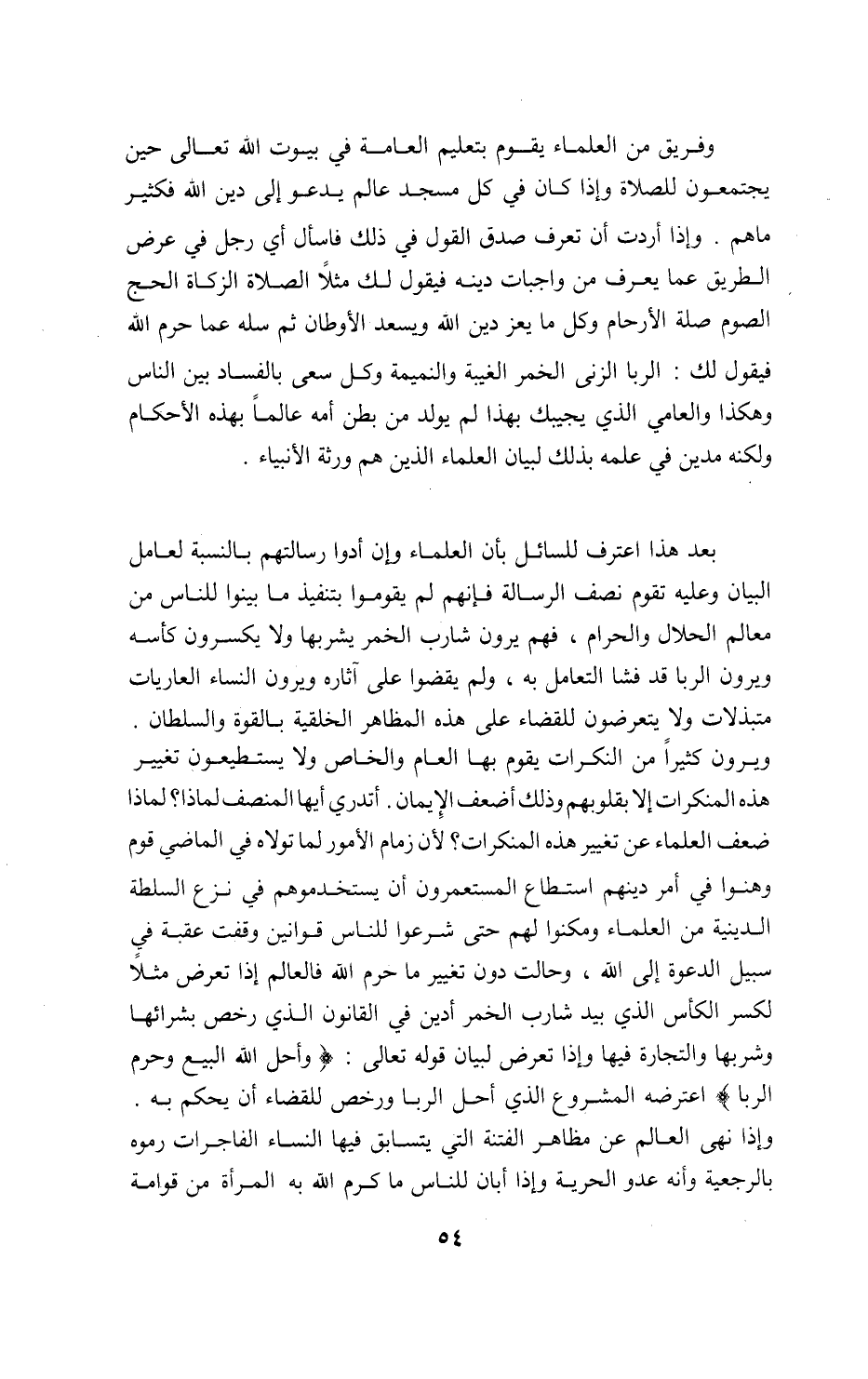 بعد هذا اعترف للسائل بأن العلماء وإن أدوا رسالتهم بالنسبة لعامل البيان وعليه تقوم نصف الرسالة فإنهم لم يقوموا بتنفيذ ما بينوا للناس من معالم الحلال والحرام، فهم يرون شارب الخمر يشربها ولا يكسرون كأسه ويرون الربا قد فشا التعامل به، ولم يقضوا على آثاره ويرون النساء العاريات متبذلات ولا يتعرضون للقضاء على هذه المظاهر الخلقية بالقوة والسلطان.