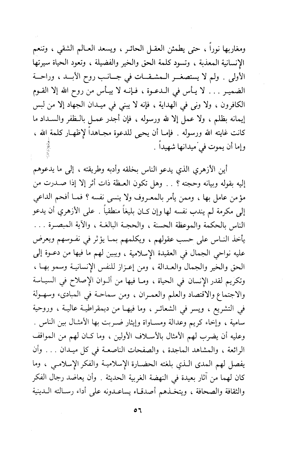أين الأزهري الذي يدعو الناس بخلقه وأدبه وطريقته، إلى ما يدعوهم إليه بقوله وبيانه وحجته؟. . وهل تكون العظة ذات أثر إلا إذا صدرت من مؤمن عامل بها، وممن يأمر بالمعروف ولا ينسى نفسه؟ فما أفحم الداعي إلى مكرمة لم يندب نفسه لها وإن كان بليغا منطقيا. على الأزهري أن يدعو الناس بالحكمة والموعظة الحسنة، والحجة البالغة، والآية المبصرة. . .