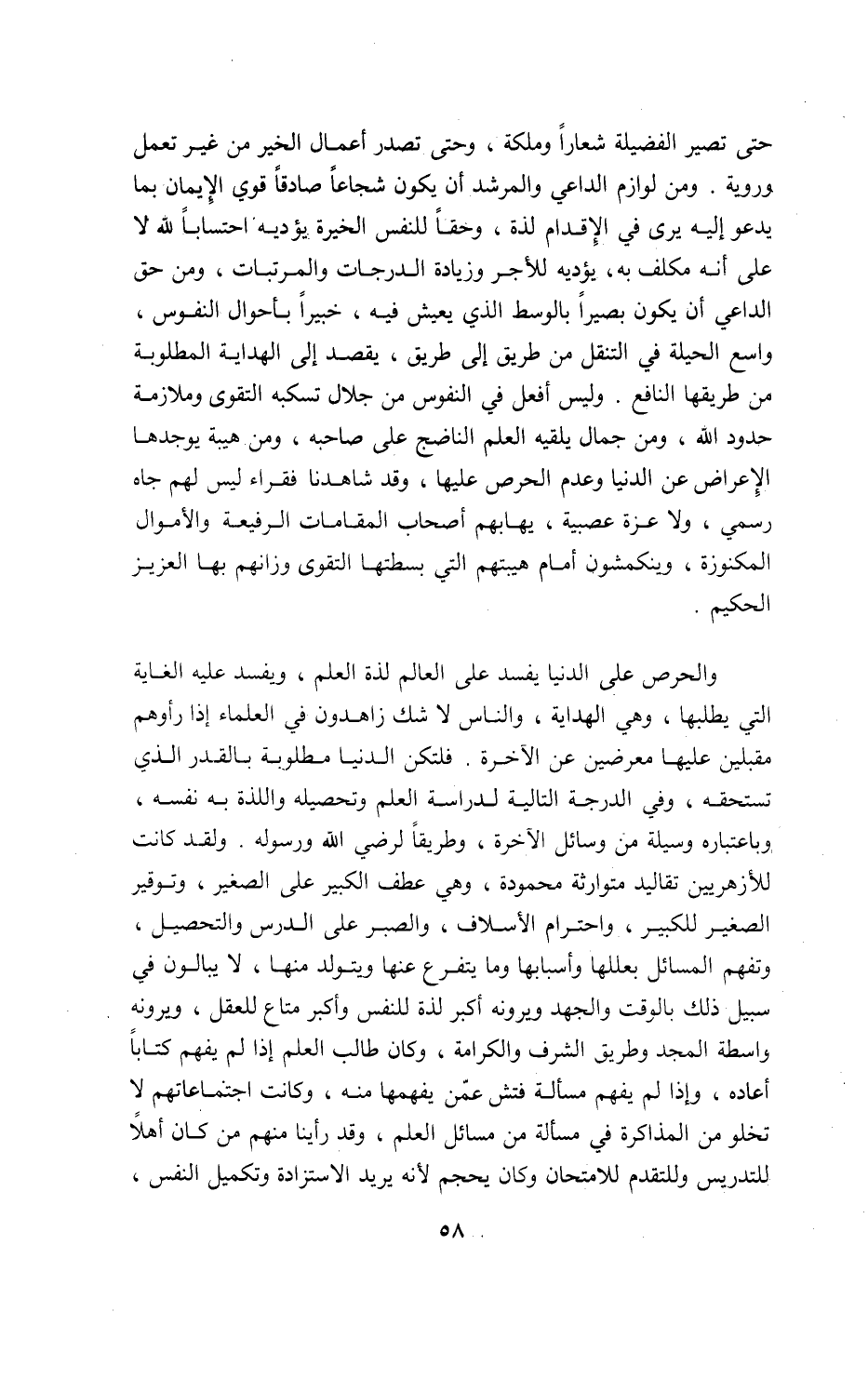 والحرص على الدنيا يفسد على العالم لذة العلم، ويفسد عليه الغاية التي يطلبها، وهي الهداية، والناس لا شك زاهدون في العلماء إذا رأوهم مقبلين عليها معرضين عن الآخرة. فلتكن الدنيا مطلوبة بالقدر الذي تستحقه، وفي الدرجة التالية لدراسة العلم وتحصيله واللذة به نفسه، وباعتباره وسيلة من وسائل الآخرة، وطريقا لرضي اللّه ورسوله. ولقد كانت للأزهريين تقاليد متوارثة محمودة، وهي عطف الكبير على الصغير، وتوقير الصغير للكبير، واحترام الأسلاف، والصبر على الدرس والتحصيل، وتفهم المسائل بعللها وأسبابها وما يتفرع عنها ويتولد منها، لا يبالون في سبيل ذلك بالوقت والجهد ويرونه أكبر لذة للنفس وأكبر متاع للعقل، ويرونه واسطة المجد وطريق الشرف والكرامة، وكان طالب العلم إذا لم يفهم كتابا أعاده، وإذا لم يفهم مسألة فتش عمّن يفهمها منه، وكانت اجتماعاتهم لا تخلو من المذاكرة في مسألة من مسائل العلم، وقد رأينا منهم من كان أهلا للتدريس وللتقدم للامتحان وكان يحجم لأنه يريد الاستزادة وتكميل النفس،