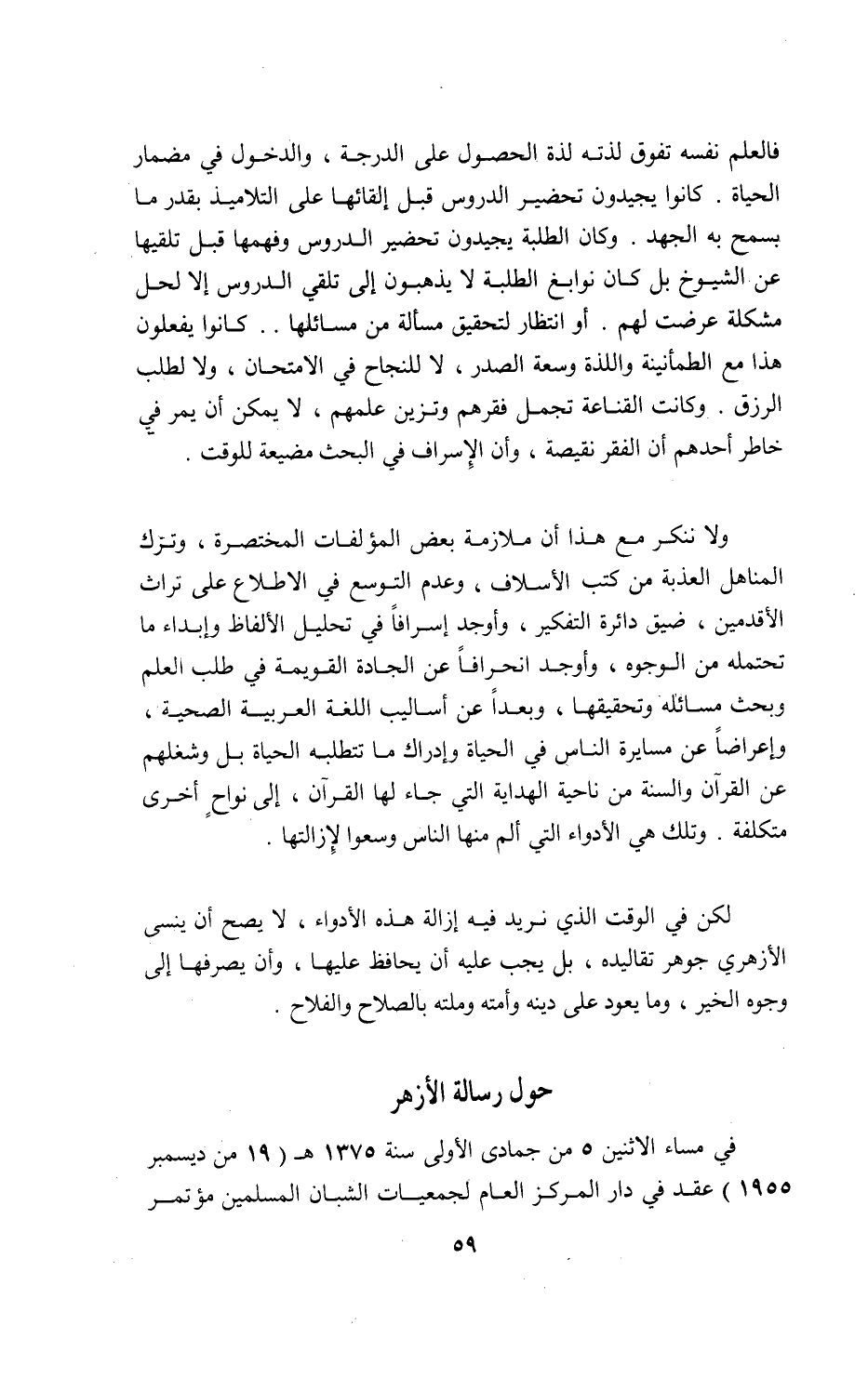 فالعلم نفسه تفوق لذته لذة الحصول على الدرجة، والدخول في مضمار الحياة. كانوا يجيدون تحضير الدروس قبل إلقائها على التلاميذ بقدر ما بسمح به الجهد. وكان الطلبة يجيدون تحضير الدروس وفهمها قبل تلقيها عن الشيوخ بل كان نوابغ الطلبة لا يذهبون إلى تلقي الدروس إلا لحل مشكلة عرضت لهم. أو انتظار لتحقيق مسألة من مسائلها. . كانوا يفعلون هذا مع الطمأنينة واللذة وسعة الصدر، لا للنجاح في الامتحان، ولا لطلب الرزق. وكانت القناعة تجمل فقرهم وتزين علمهم، لا يمكن أن يمر في خاطر أحدهم أن الفقر نقيصة، وأن الإسراف في البحث مضيعة للوقت.
