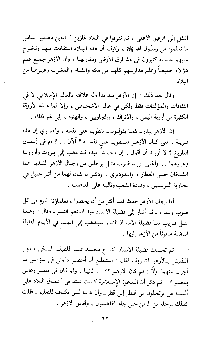 وقال بعد ذلك: إن الأزهر منذ بدأ وله علاقته بالعالم الإسلامي لا في الثقافات والمؤلفات فقط ولكن في عالم الأشخاص، وإلا فما هذه الأروقة الكثيرة من أروقة اليمن، والأتراك، والجاويين، والهنود، إلى غير ذلك.