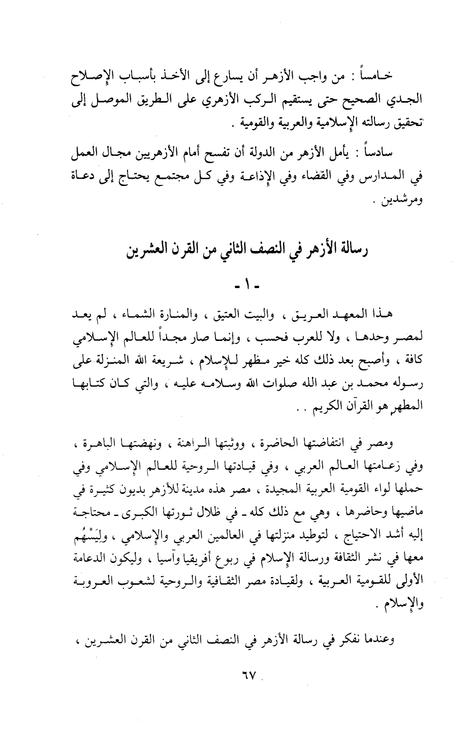 خامسا: من واجب الأزهر أن يسارع إلى الأخذ بأسباب الإصلاح الجدي الصحيح حتى يستقيم الركب الأزهري على الطريق الموصل إلى تحقيق رسالته الإسلامية والعربية والقومية.