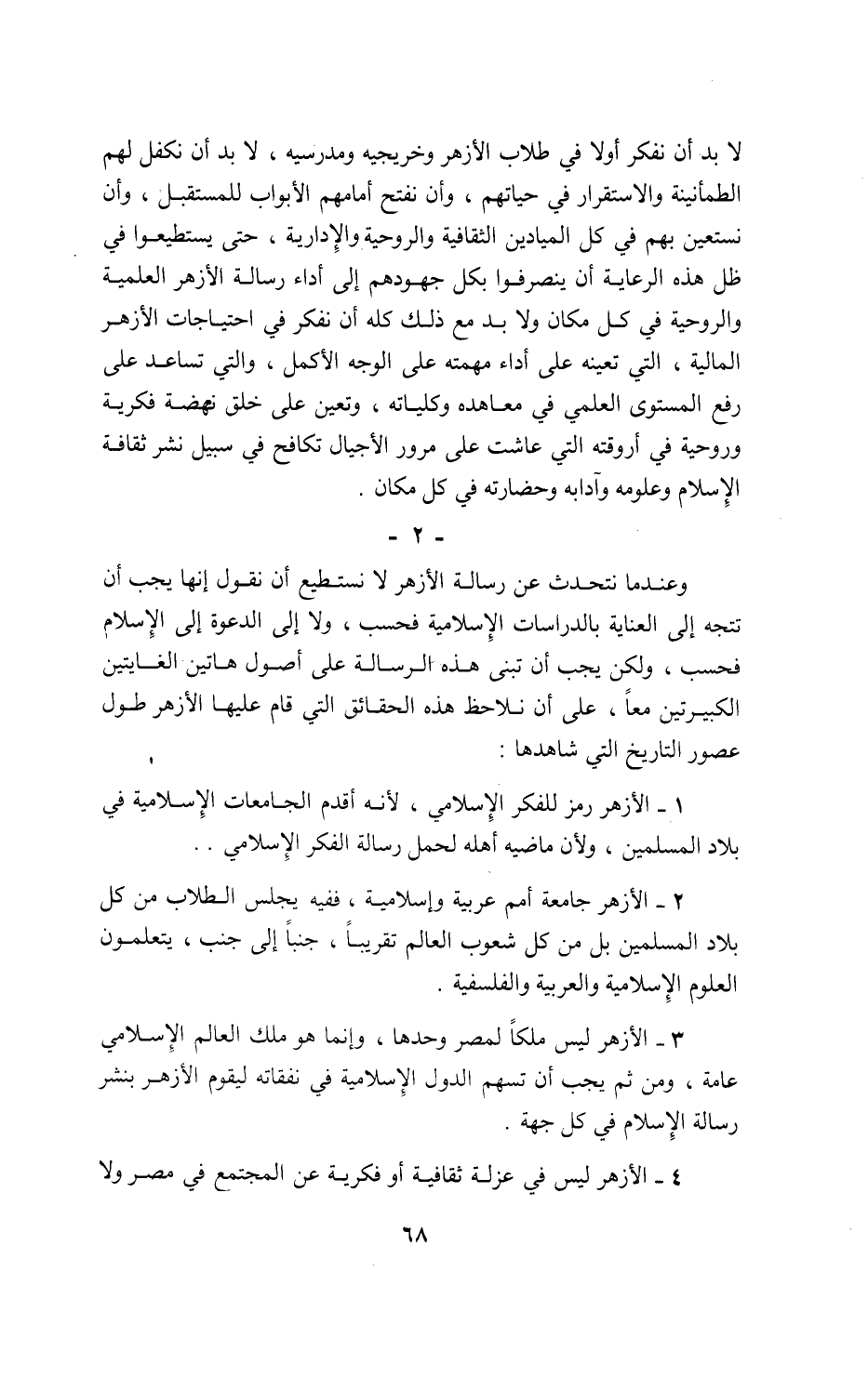 3 - الأزهر ليس ملكا لمصر وحدها، وإنما هو ملك العالم الإسلامي عامة، ومن ثم يجب أن تسهم الدول الإسلامية في نفقاته ليقوم الأزهر بنشر رسالة الإسلام في كل جهة.