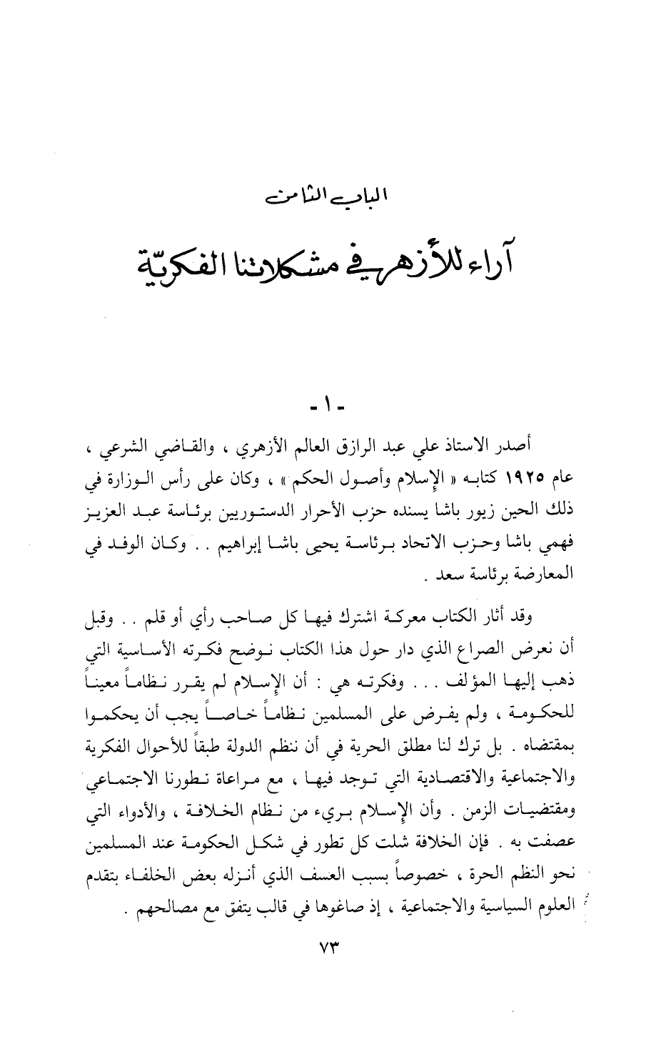 وقد أثار الكتاب معركة اشترك فيها كل صاحب رأي أو قلم. . وقبل أن نعرض الصراع الذي دار حول هذا الكتاب نوضح فكرته الأساسية التي ذهب إليها المؤلف. . . وفكرته هي: أن الإسلام لم يقرر نظاما معينا للحكومة، ولم يفرض على المسلمين نظاما خاصا يجب أن يحكموا بمقتضاه. بل ترك لنا مطلق الحرية في أن ننظم الدولة طبقا للأحوال الفكرية والاجتماعية والاقتصادية التي توجد فيها، مع مراعاة تطورنا الاجتماعي ومقتضيات الزمن. وأن الإسلام بريء من نظام الخلافة، والأدواء التي عصفت به. فإن الخلافة شلت كل تطور في شكل الحكومة عند المسلمين نحو النظم الحرة، خصوصا بسبب العسف الذي أنزله بعض الخلفاء بتقدم العلوم السياسية والاجتماعية، إذ صاغوها في قالب يتفق مع مصالحهم.