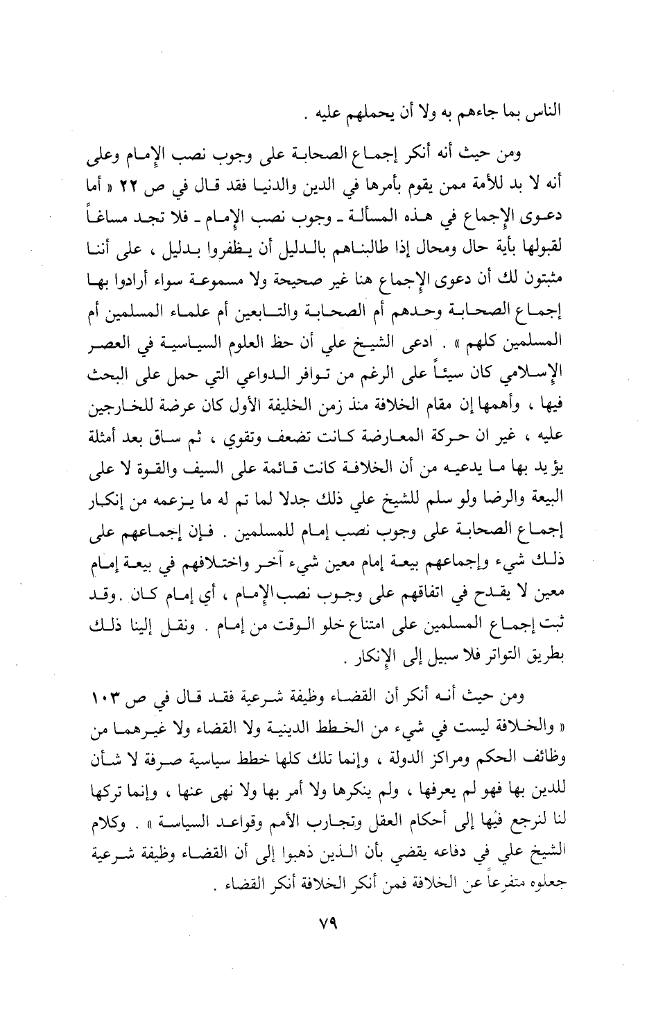 ومن حيث أنه أنكر إجماع الصحابة على وجوب نصب الإمام وعلى أنه لا بد للأمة ممن يقوم بأمرها في الدين والدنيا فقد قال في ص 22 «أما دعوى الإجماع في هذه المسألة-وجوب نصب الإمام-فلا تجد مساغا لقبولها بأية حال ومحال إذا طالبناهم بالدليل أن يظفروا بدليل، على أننا مثبتون لك أن دعوى الإجماع هنا غير صحيحة ولا مسموعة سواء أرادوا بها إجماع الصحابة وحدهم أم الصحابة والتابعين أم علماء المسلمين أم المسلمين كلهم». ادعى الشيخ علي أن حظ العلوم السياسية في العصر الإسلامي كان سيئا على الرغم من توافر الدواعي التي حمل على البحث فيها، وأهمها إن مقام الخلافة منذ زمن الخليفة الأول كان عرضة للخارجين عليه، غير ان حركة المعارضة كانت تضعف وتقوي، ثم ساق بعد أمثلة يؤيد بها ما يدعيه من أن الخلافة كانت قائمة على السيف والقوة لا على البيعة والرضا ولو سلم للشيخ علي ذلك جدلا لما تم له ما يزعمه من إنكار إجماع الصحابة على وجوب نصب إمام للمسلمين. فإن إجماعهم على ذلك شيء وإجماعهم بيعة إمام معين شيء آخر واختلافهم في بيعة إمام معين لا يقدح في اتفاقهم على وجوب نصب الإمام، أي إمام كان. وقد ثبت إجماع المسلمين على امتناع خلو الوقت من إمام. ونقل إلينا ذلك بطريق التواتر فلا سبيل إلى الإنكار.