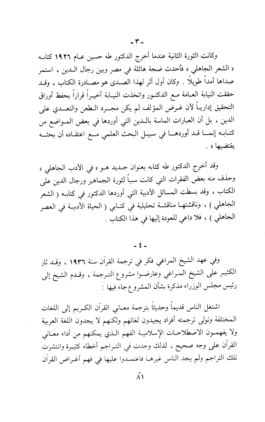 وفي عهد الشيخ المراغي فكر في ترجمة القرآن سنة 1936، وقد ثار الكثير على الشيخ المراغي وعارضوا مشروع الترجمة، وقدم الشيخ إلى رئيس مجلس الوزراء مذكرة بشأن المشروع جاء فيها:
