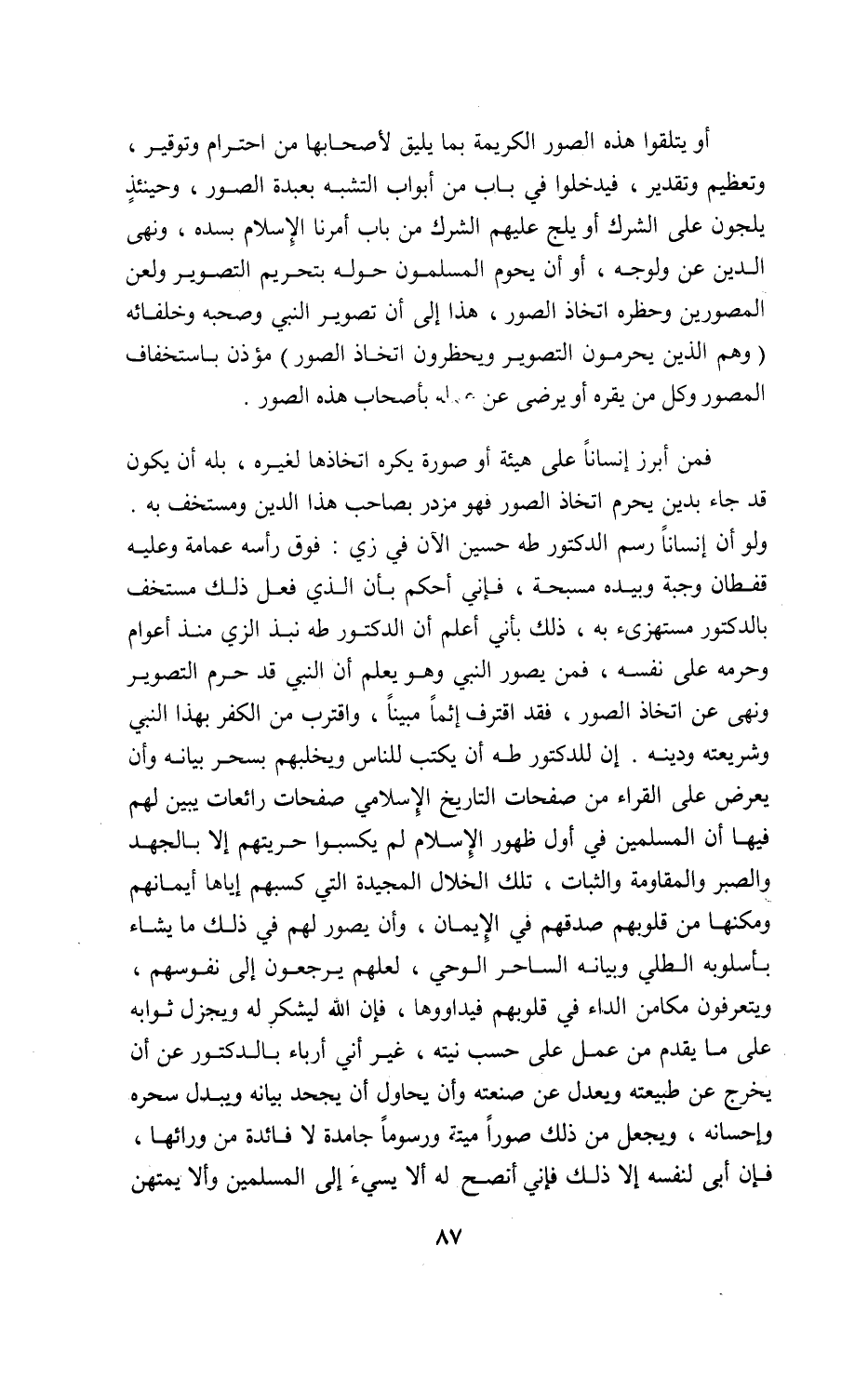 ولو أن إنسانا رسم الدكتور طه حسين الآن في زي: فوق رأسه عمامة وعليه قفطان وجبة وبيده مسبحة، فإني أحكم بأن الذي فعل ذلك مستخف بالدكتور مستهزىء به، ذلك بأني أعلم أن الدكتور طه نبذ الزي منذ أعوام وحرمه على نفسه، فمن يصور النبي وهو يعلم أن النبي قد حرم التصوير ونهى عن اتخاذ الصور، فقد اقترف إثما مبينا، واقترب من الكفر بهذا النبي وشريعته ودينه. إن للدكتور طه أن يكتب للناس ويخلبهم بسحر بيانه وأن يعرض على القراء من صفحات التاريخ الإسلامي صفحات رائعات يبين لهم فيها أن المسلمين في أول ظهور الإسلام لم يكسبوا حريتهم إلا بالجهد والصبر والمقاومة والثبات، تلك الخلال المجيدة التي كسبهم إياها أيمانهم ومكنها من قلوبهم صدقهم في الإيمان، وأن يصور لهم في ذلك ما يشاء بأسلوبه الطلي وبيانه الساحر الوحي، لعلهم يرجعون إلى نفوسهم، ويتعرفون مكامن الداء في قلوبهم فيداووها، فإن اللّه ليشكر له ويجزل ثوابه على ما يقدم من عمل على حسب نيته، غير أني أرباء بالدكتور عن أن يخرج عن طبيعته ويعدل عن صنعته وأن يحاول أن يجحد بيانه ويبدل سحره وإحسانه، ويجعل من ذلك صورا ميتة ورسوما جامدة لا فائدة من ورائها، فإن أبى لنفسه إلا ذلك فإني أنصح له ألا يسيء إلى المسلمين وألا يمتهن