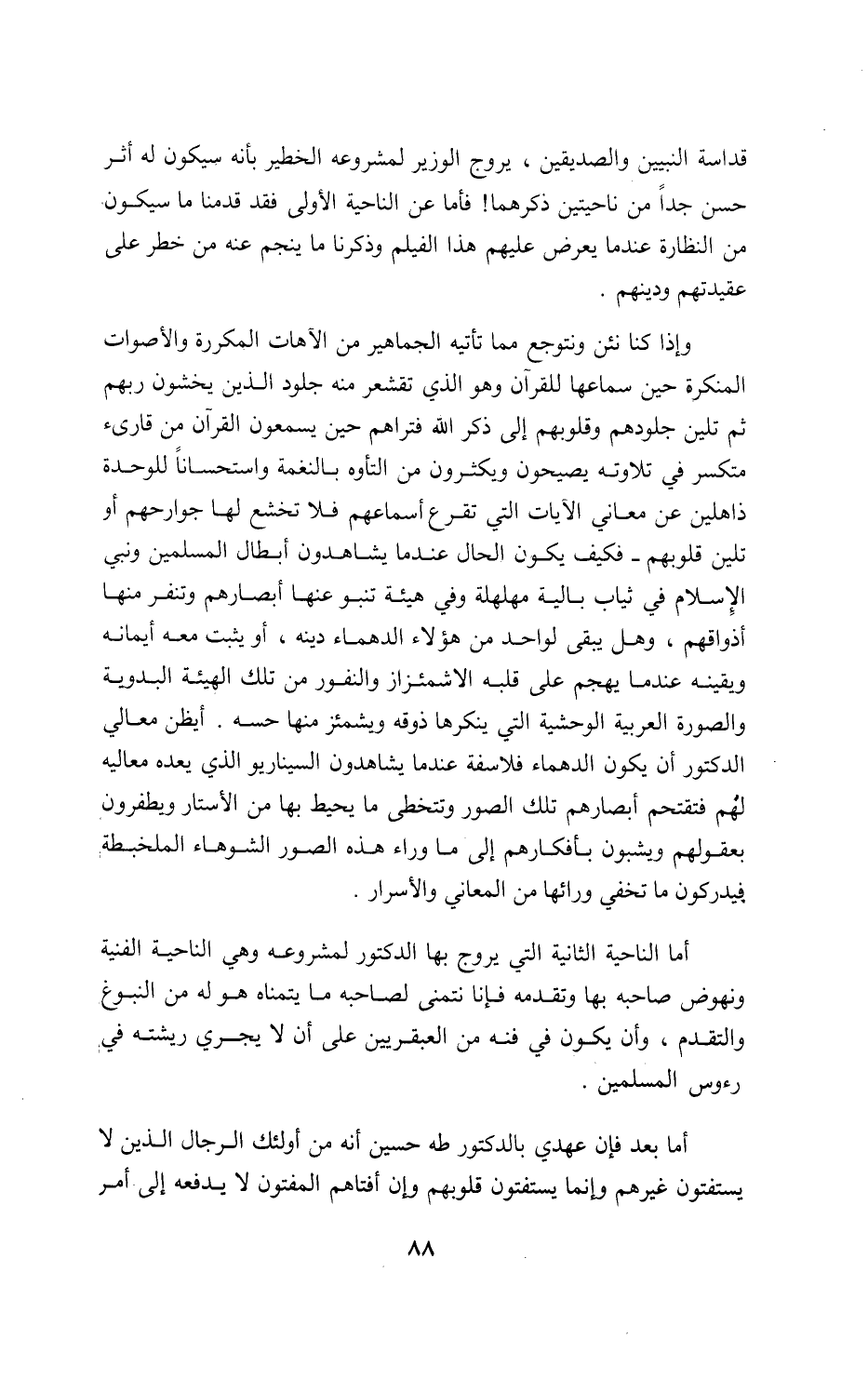 وإذا كنا نئن ونتوجع مما تأتيه الجماهير من الآهات المكررة والأصوات المنكرة حين سماعها للقرآن وهو الذي تقشعر منه جلود الذين يخشون ربهم ثم تلين جلودهم وقلوبهم إلى ذكر اللّه فتراهم حين يسمعون القرآن من قارىء متكسر في تلاوته يصيحون ويكثرون من التأوه بالنغمة واستحسانا للوحدة ذاهلين عن معاني الآيات التي تقرع أسماعهم فلا تخشع لها جوارحهم أو تلين قلوبهم-فكيف يكون الحال عند ما يشاهدون أبطال المسلمين ونبي الإسلام في ثياب بالية مهلهلة وفي هيئة تنبو عنها أبصارهم وتنفر منها أذواقهم، وهل يبقى لواحد من هؤلاء الدهماء دينه، أو يثبت معه أيمانه ويقينه عند ما يهجم على قلبه الاشمئزاز والنفور من تلك الهيئة البدوية والصورة العربية الوحشية التي ينكرها ذوقه ويشمئز منها حسه. أيظن معالي الدكتور أن يكون الدهماء فلاسفة عند ما يشاهدون السيناريو الذي يعده معاليه لهم فتقتحم أبصارهم تلك الصور وتتخطى ما يحيط بها من الأستار ويطفرون بعقولهم ويشبون بأفكارهم إلى ما وراء هذه الصور الشوهاء الملخبطة فيدركون ما تخفي ورائها من المعاني والأسرار.