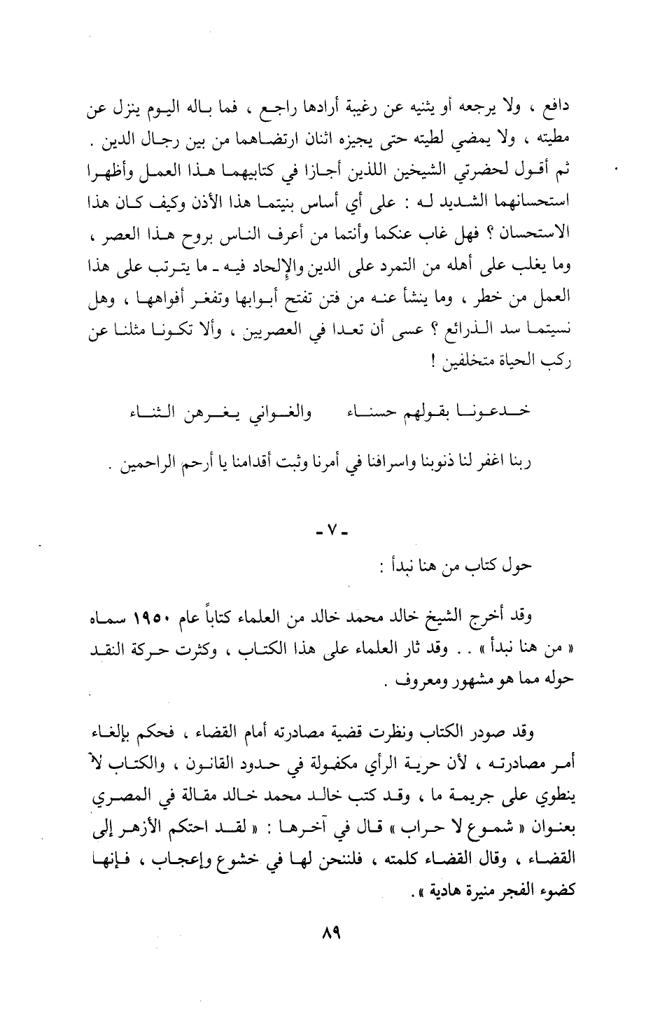 وقد أخرج الشيخ خالد محمد خالد من العلماء كتابا عام 1950 سماه «من هنا نبدأ». . وقد ثار العلماء على هذا الكتاب، وكثرت حركة النقد حوله مما هو مشهور ومعروف.
