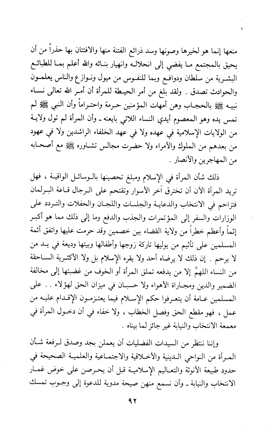 ذلك شأن المرأة في الإسلام ومبلغ تحصينها بالوسائل الواقية، فهل تريد المرأة الآن أن تخترق آخر الأسوار وتقتحم على الرجال قاعة البرلمان فتزاحم في الانتخاب والدعاية والجلسات واللجان والحفلات والتردد على الوزارات والسفر إلى المؤتمرات والجذب والدفع وما إلى ذلك مما هو أكبر إثما وأعظم خطرا من ولاية القضاء بين خصمين وقد حرمت عليها واتفق أئمة المسلمين على تأثيم من يوليها تاركة زوجها وأطفالها وبيتها وديعة في يد من لا يرحم. إن ذلك لا يرضاه أحد ولا يقره الإسلام بل ولا الأكثرية الساحقة من النساء اللهمّ إلا من يدفعه تملق المرأة أو الخوف من غضبتها إلى مخالفة الضمير والدين ومجاراة الأهواء ولا حسبان في ميزان الحق لهؤلاء. . على المسلمين عامة أن يتعرفوا حكم الإسلام فيما يعتزمون الإقدام عليه من عمل، فهو مقطع الحق وفصل الخطاب، ولا خفاء في أن دخول المرأة في معمعة الانتخاب والنيابة غير جائز لما بيناه.