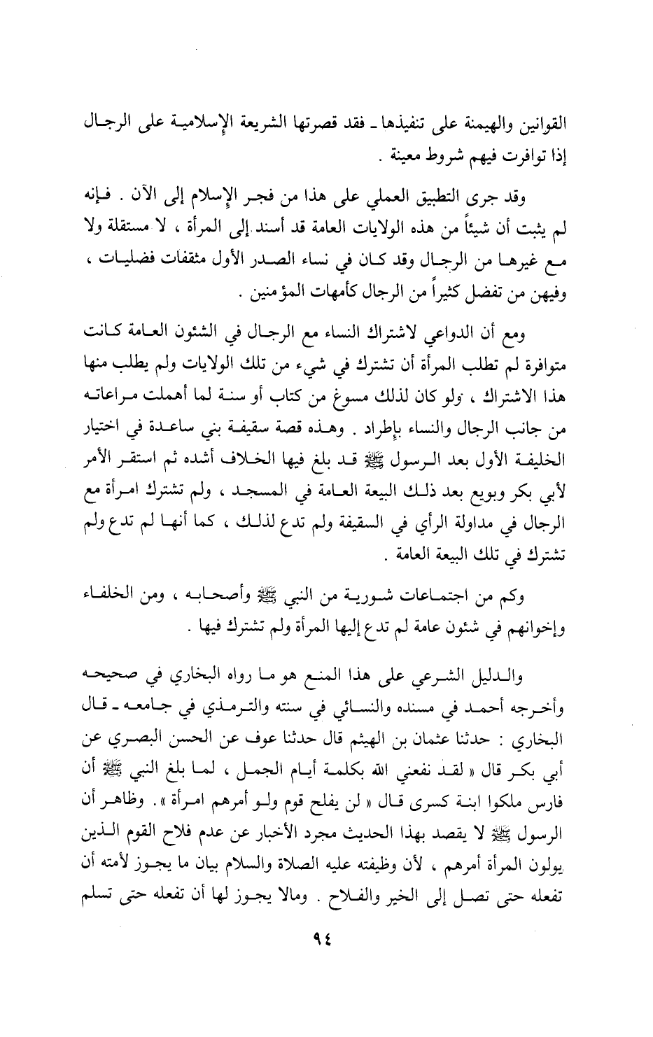 ومع أن الدواعي لاشتراك النساء مع الرجال في الشئون العامة كانت متوافرة لم تطلب المرأة أن تشترك في شيء من تلك الولايات ولم يطلب منها هذا الاشتراك، ولو كان لذلك مسوغ من كتاب أو سنة لما أهملت مراعاته من جانب الرجال والنساء بإطراد. وهذه قصة سقيفة بني ساعدة في اختيار الخليفة الأول بعد الرسول صلى اللّه عليه وسلم قد بلغ فيها الخلاف أشده ثم استقر الأمر لأبي بكر وبويع بعد ذلك البيعة العامة في المسجد، ولم تشترك امرأة مع الرجال في مداولة الرأي في السقيفة ولم تدع لذلك، كما أنها لم تدع ولم تشترك في تلك البيعة العامة.