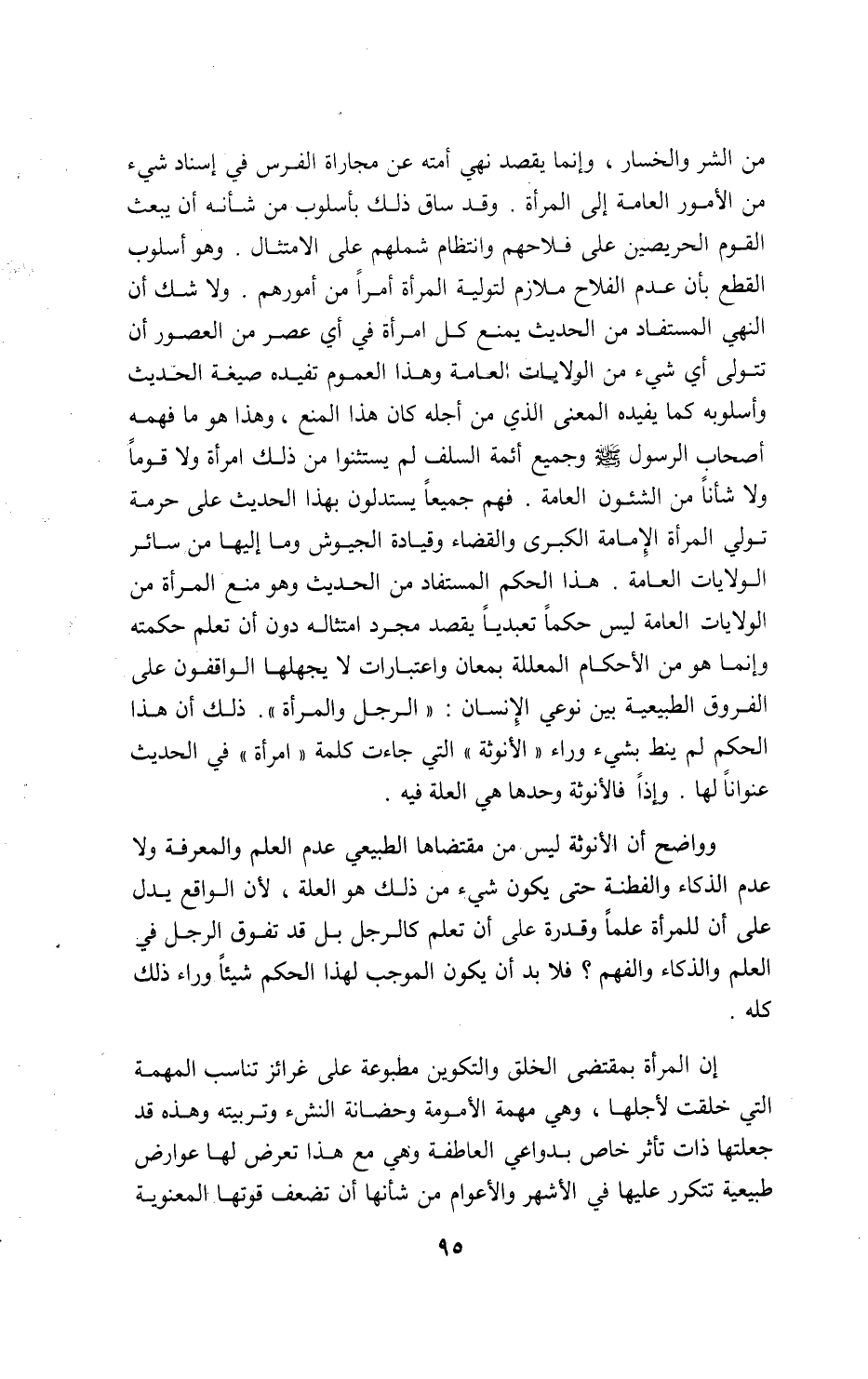 من الشر والخسار، وإنما يقصد نهي أمته عن مجاراة الفرس في إسناد شيء من الأمور العامة إلى المرأة. وقد ساق ذلك بأسلوب من شأنه أن يبعث القوم الحريصين على فلاحهم وانتظام شملهم على الامتثال. وهو أسلوب القطع بأن عدم الفلاح ملازم لتولية المرأة أمرا من أمورهم. ولا شك أن النهي المستفاد من الحديث يمنع كل امرأة في أي عصر من العصور أن تتولى أي شيء من الولايات العامة وهذا العموم تفيده صيغة الحديث وأسلوبه كما يفيده المعنى الذي من أجله كان هذا المنع، وهذا هو ما فهمه أصحاب الرسول صلى اللّه عليه وسلم وجميع أئمة السلف لم يستثنوا من ذلك امرأة ولا قوما ولا شأنا من الشئون العامة. فهم جميعا يستدلون بهذا الحديث على حرمة تولي المرأة الإمامة الكبرى والقضاء وقيادة الجيوش وما إليها من سائر الولايات العامة. هذا الحكم المستفاد من الحديث وهو منع المرأة من الولايات العامة ليس حكما تعبديا يقصد مجرد امتثاله دون أن تعلم حكمته وإنما هو من الأحكام المعللة بمعان واعتبارات لا يجهلها الواقفون على الفروق الطبيعية بين نوعي الإنسان: «الرجل والمرأة». ذلك أن هذا الحكم لم ينط بشيء وراء «الأنوثة» التي جاءت كلمة «امرأة» في الحديث عنوانا لها. وإذا فالأنوثة وحدها هي العلة فيه.